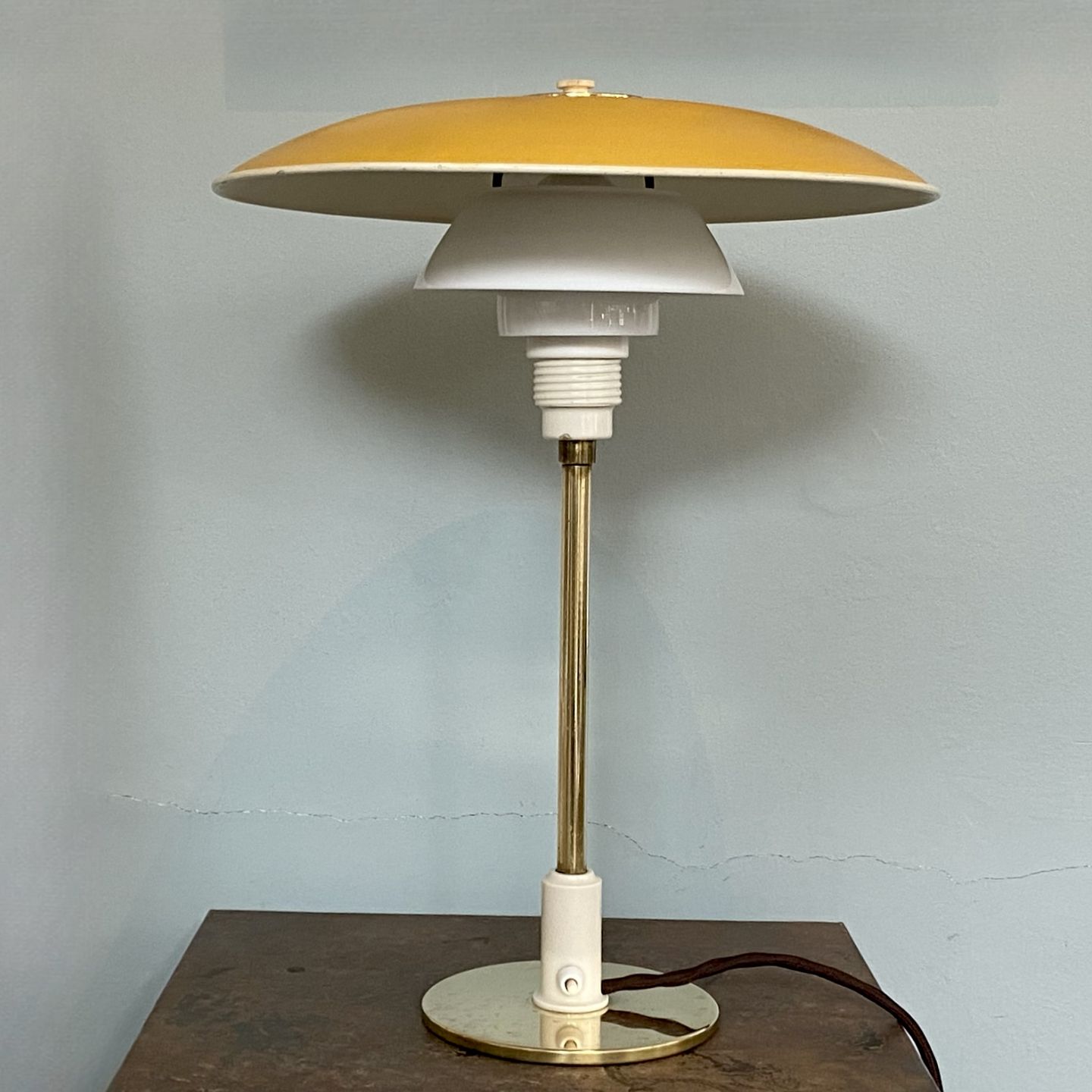 Itemnumber: 552924Poul Henningsen PH 4/2.75 table lamp with cast shade holder. Upper shade of original gold-lacquered metal Ø 40 cm., Middle and lower shade of opal glass. Socket, switch housing and top screw of white Bakelite. Stem, foot and top cover of patinated brass. Manufactured at Louis Poulsen in the 1940s. Mounted with brown cloth cord. Appearance in good condition, however with minor bakelite chipping at socket housing and top screw. H. 49 cm.