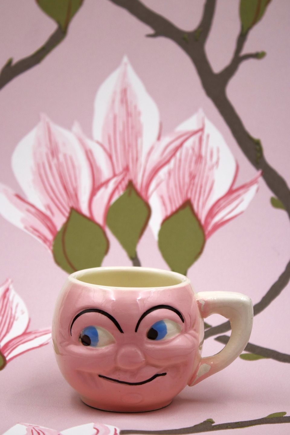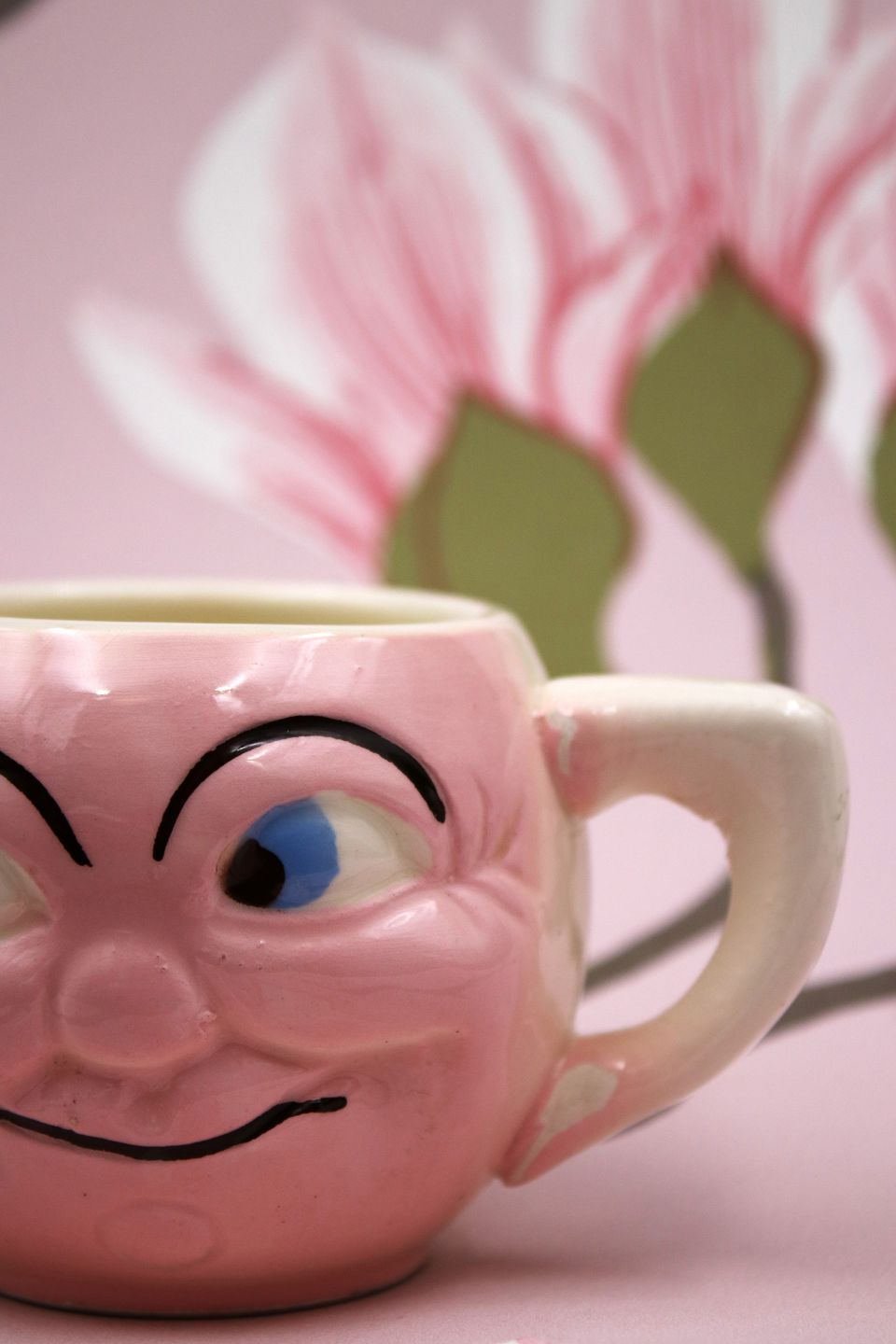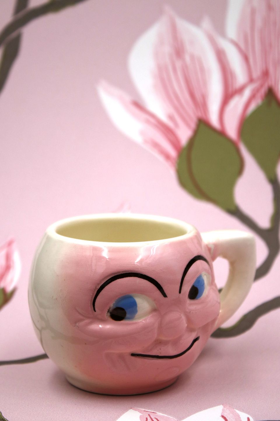 Old children's cup with a funny face in faience. The cup has a small glaze defect at the handle. H: 6.5cm. Dia.: 8.5cm.