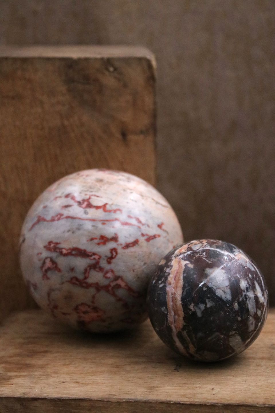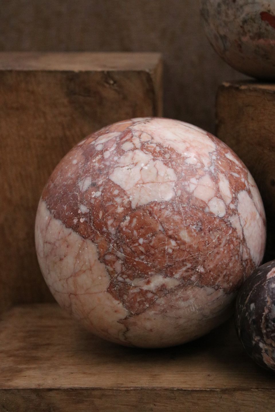 Decorative old colored marble balls, 3 pieces. Dia.: 13.5 / 9 / 6 cm. Only sold together. Item number: 3 gamle marmor kugler.