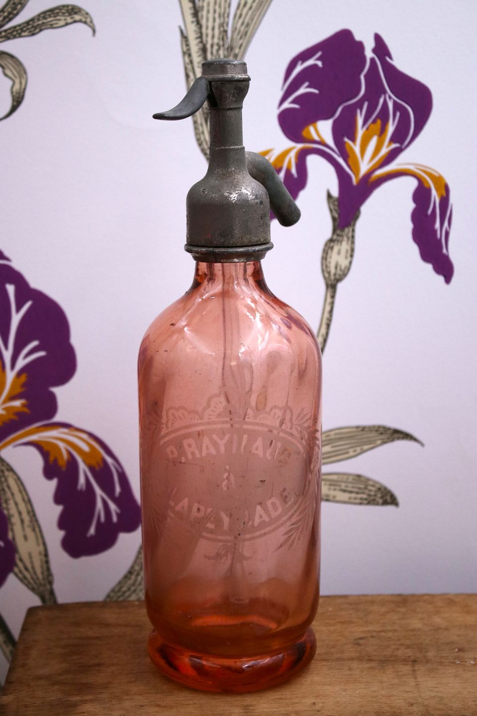 Dekorativ , sjælden fransk mini glas sifon fra begyndelsen af 1900 tallet i rosa farvet glas med graveret skrift på siden af sifonen og en fin patina.