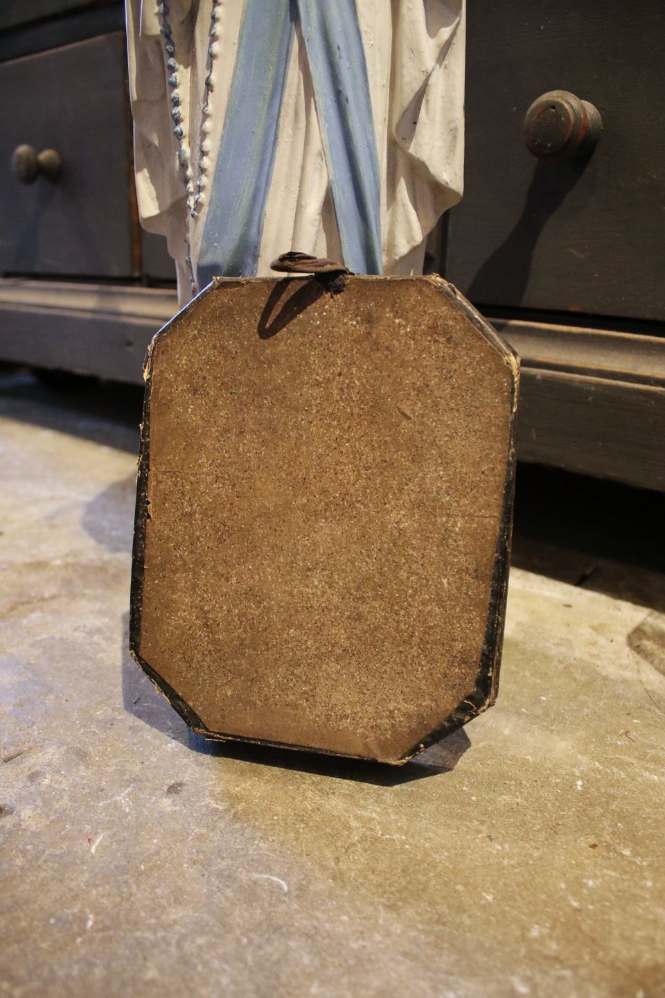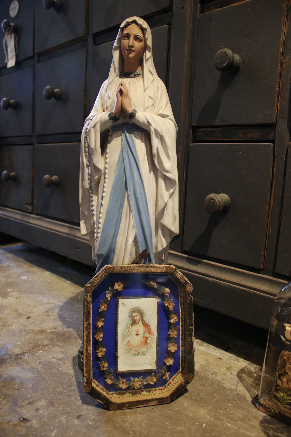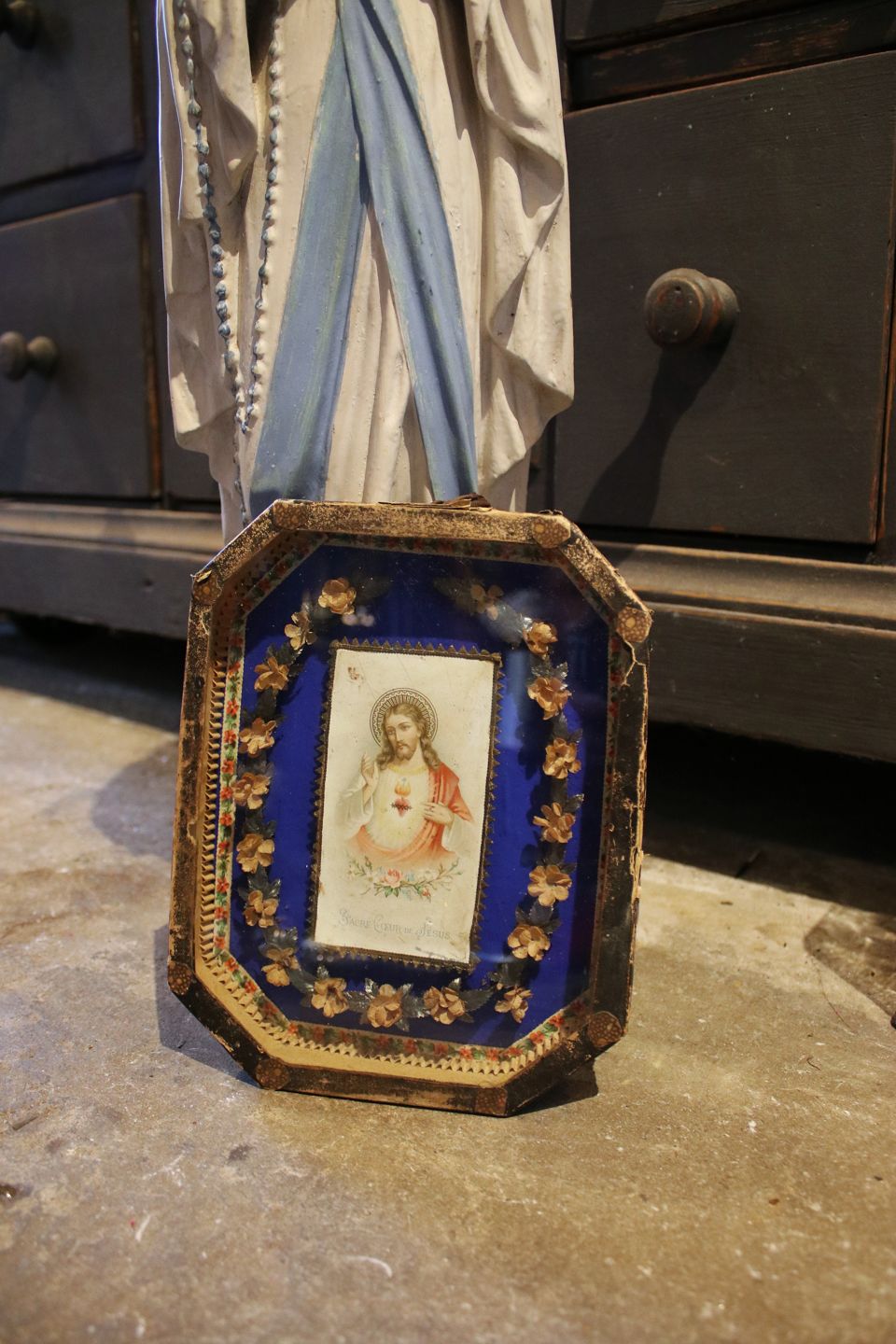 Decorative, old religious picture (with glass) with Jesus picture and fine flower wreath in fabric. Dimensions: 20.5 x 16.5cm. Depth: 3cm.