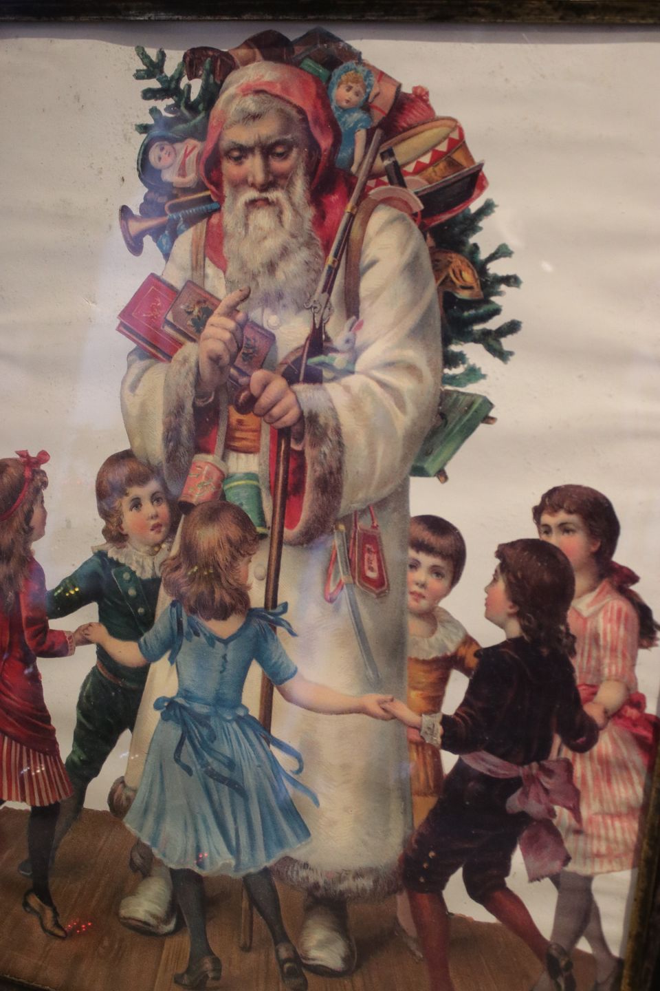 Dekorativt , gammelt billede med motiv af julemanden der deler gaver ud til børnene indrammet i gammel sort træramme med en fin patina.