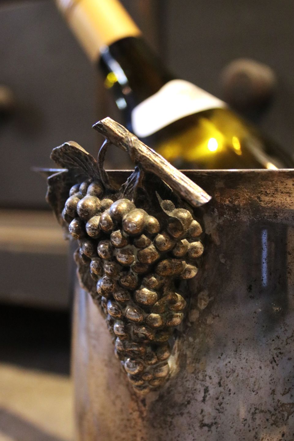 Gammel fransk vin / champagne køler i forsølvet metal med drueklaser på siden...