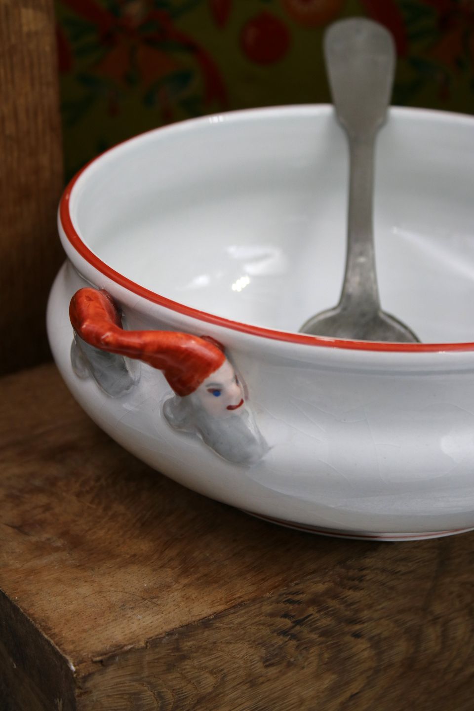 Gammel svensk juleskål i fajance med nisse på hankene. H: 7,5 cm. Dia.: 20cm. Emne nummer: Svensk juleskål