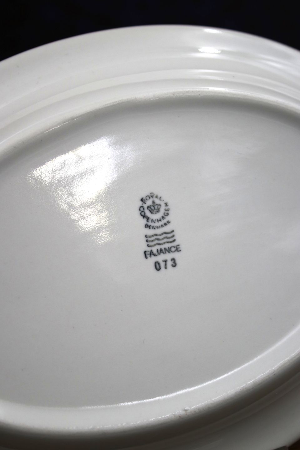 Gammelt oval Ursula fajance serverings fad / undertallerken fra Royal Copenhagen designet af Ursula Munch-Petersen med hvid glasur.