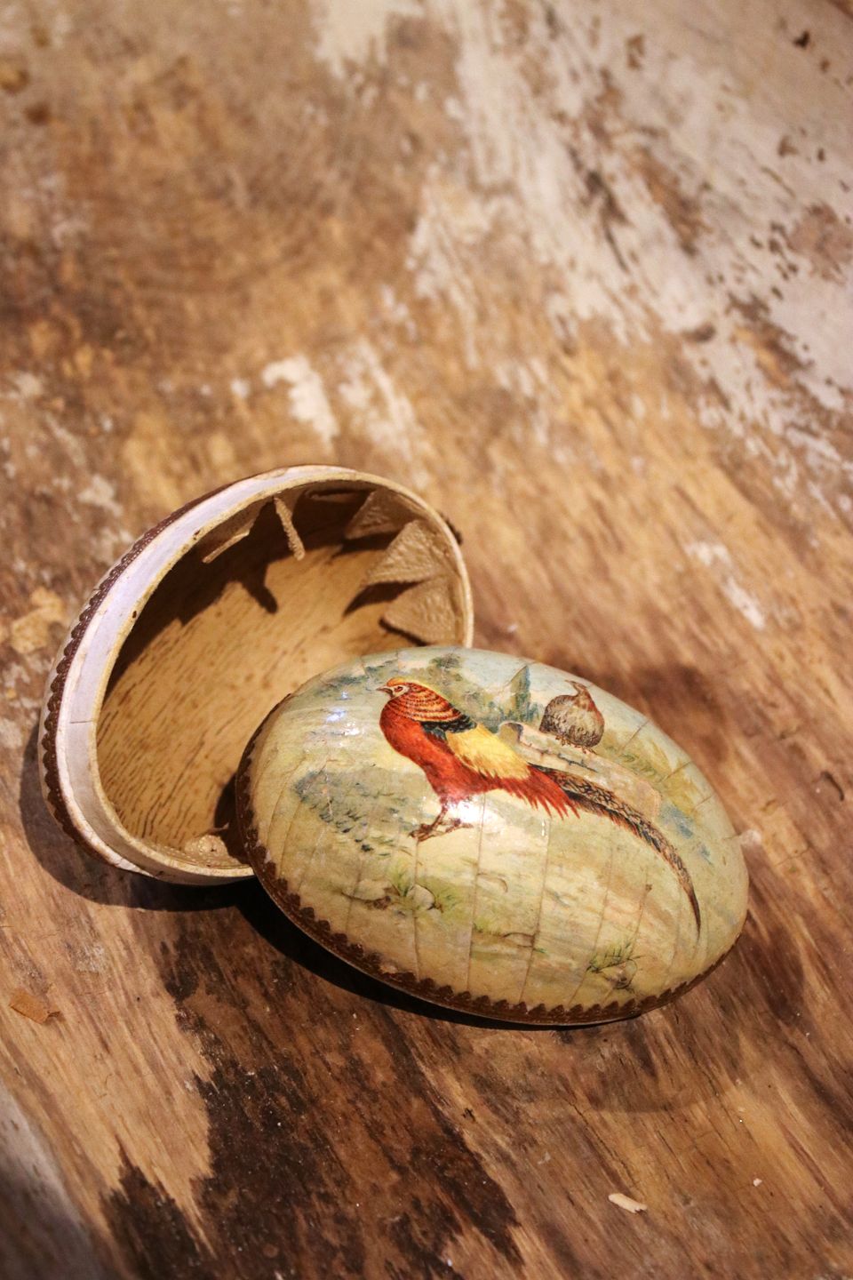 Gammelt påskeæg i træ med bemalet påfugle