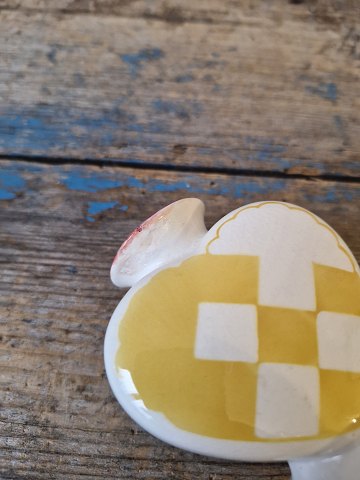 Aluminia gult julehjerte 1. sortering Højde 7,5 cm. Fremstår med små krakeleringer samt en reparation på kanten - se billed