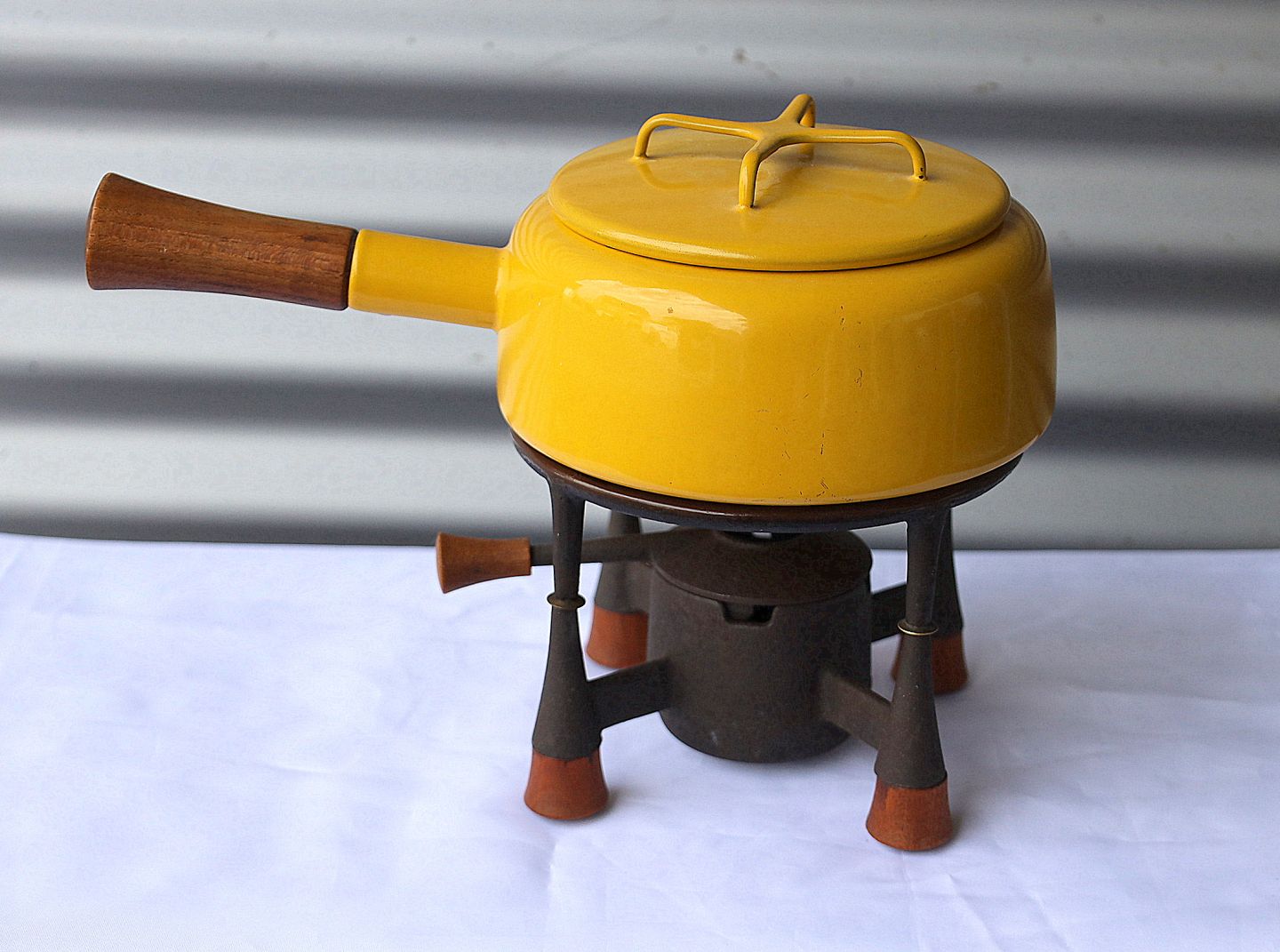 IHQ = Jens Harald Quistgaard. Gul fonduegryde med brænder. Gryde "France". Gryden er gul emaljeret jern og brænderen er støbejern. Fondue sættet bliver kaldet " Kobenstyle". Fondue sættet kommer med gryde med teaktræ håndtag, og brænder med låg med teaktræ håndtag og fødder af teaktræ.