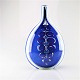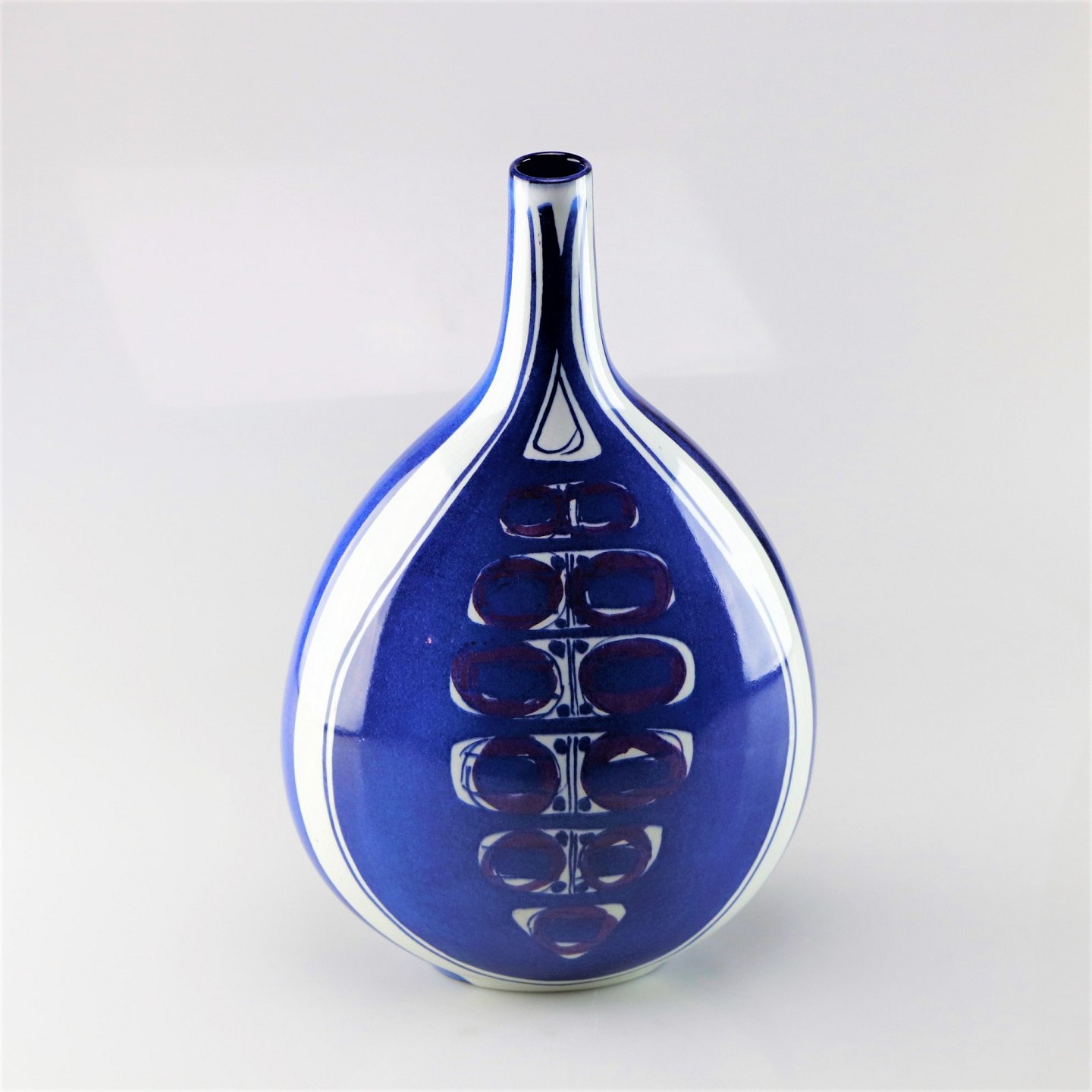 Vase med smal åbning i blå glasur dekoreret med ringe og streger