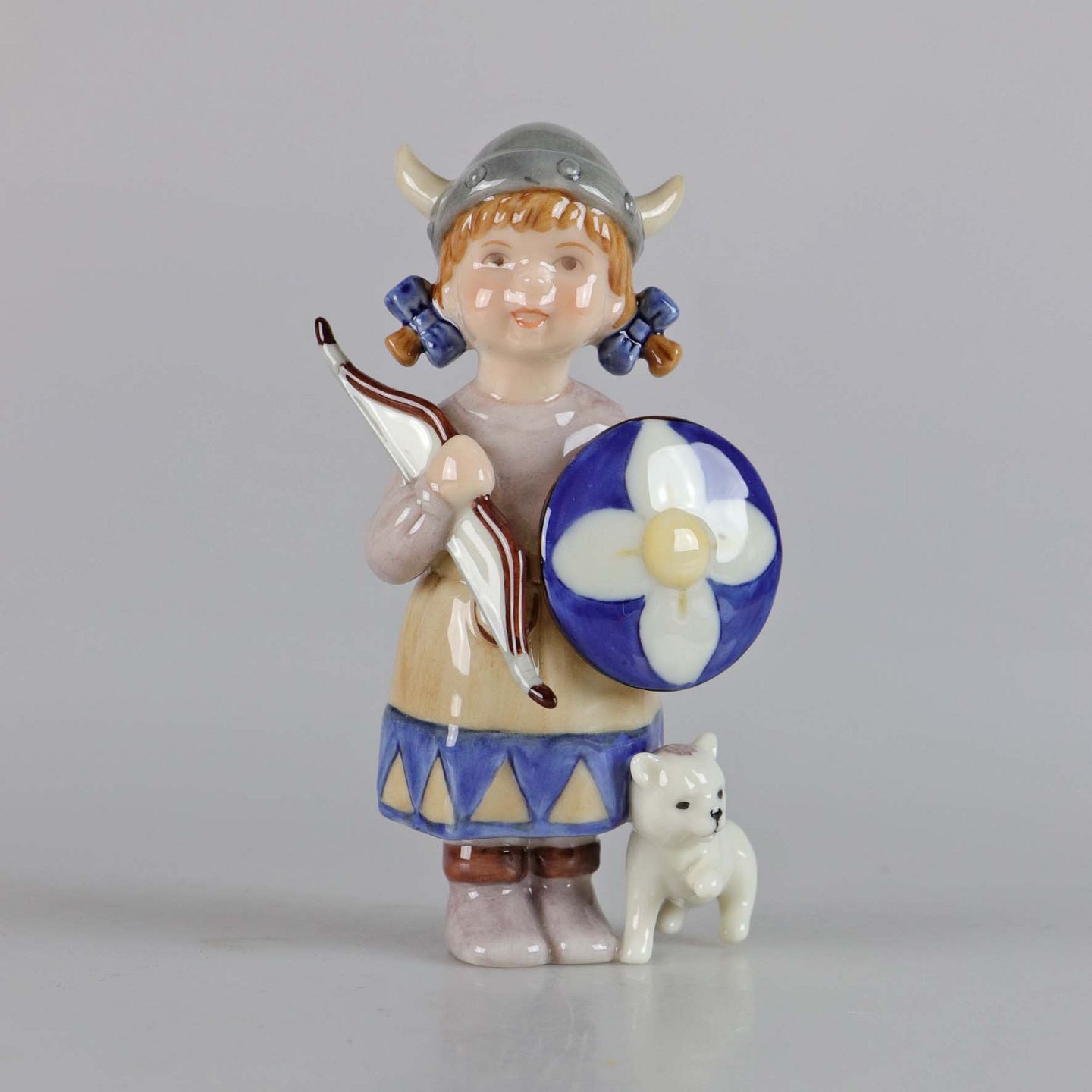 Årets Viking 2003 i porcelæn fra serien Mini Collection Viking. Pige med skjold, bue og kat. No 086 Vikingenavn: Freja.