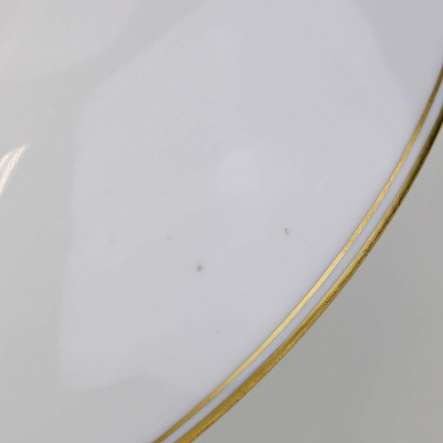Stel i glat hvidt porcelæn dekoreret med guldkurv og brune blomster samt kantet af med guldbort med bladmotiv.