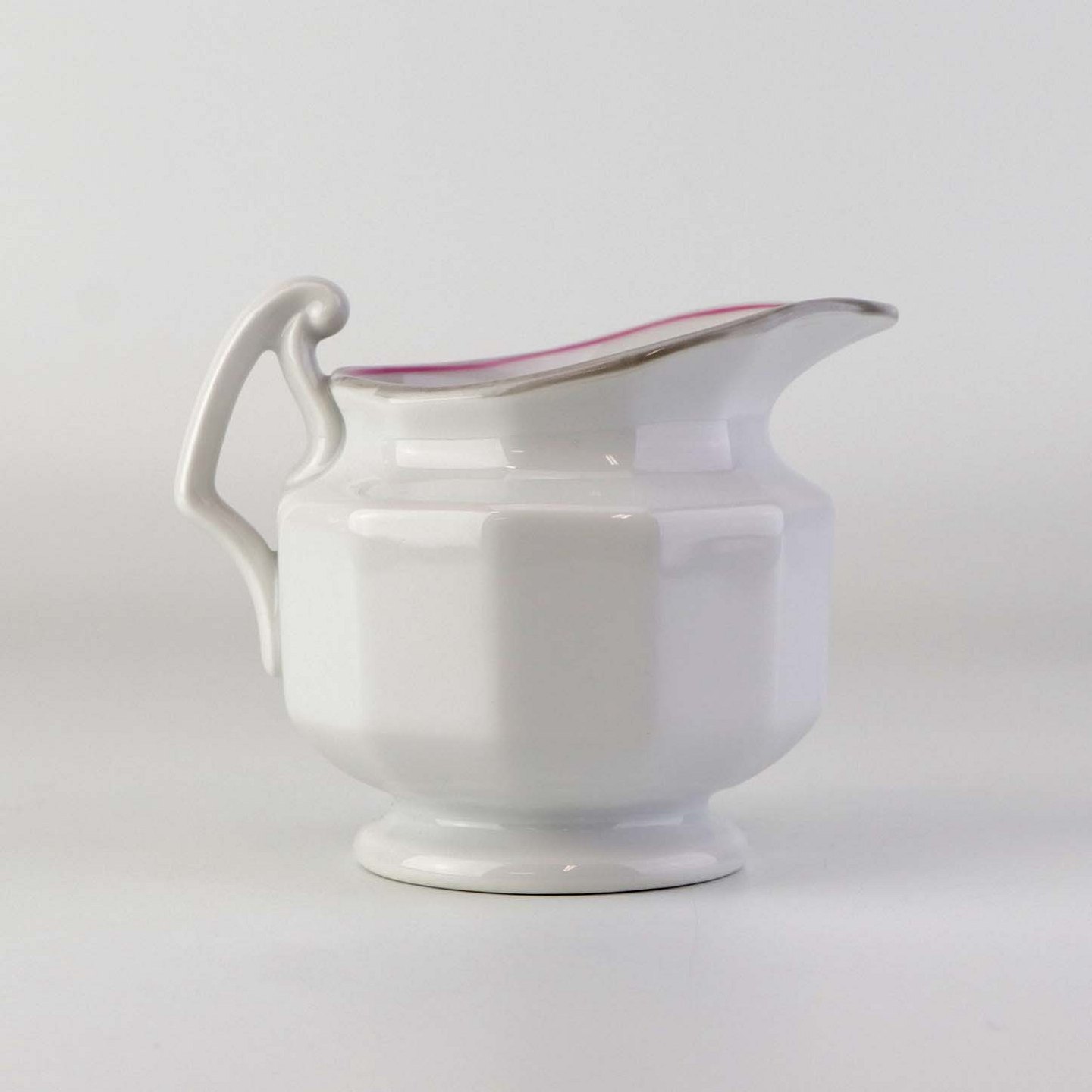 Service i kantet hvidt porcelæn dekoreret med lyserød og grå stribe ved kant.