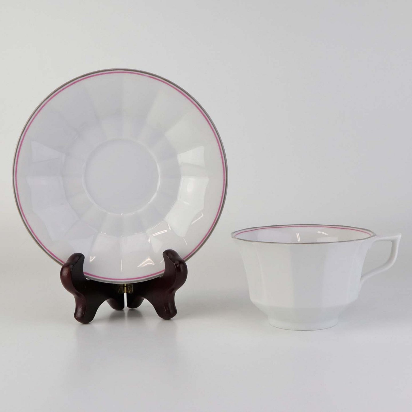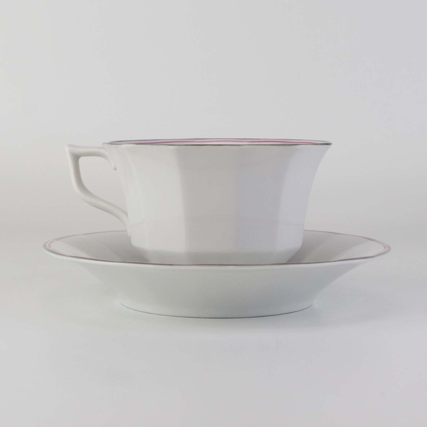 Service i kantet hvidt porcelæn dekoreret med lyserød og grå stribe ved kant.