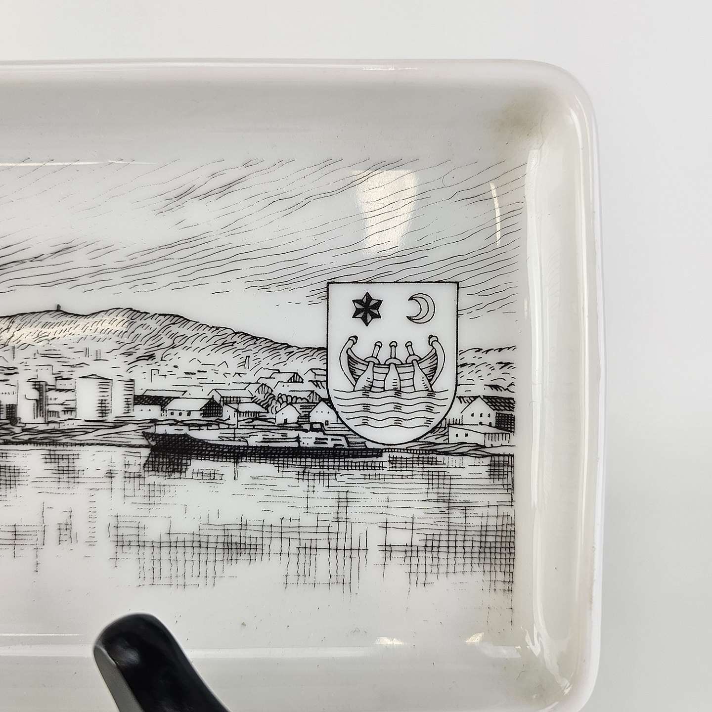 Aflangt fad i hvidt porcelæn med bymotiv