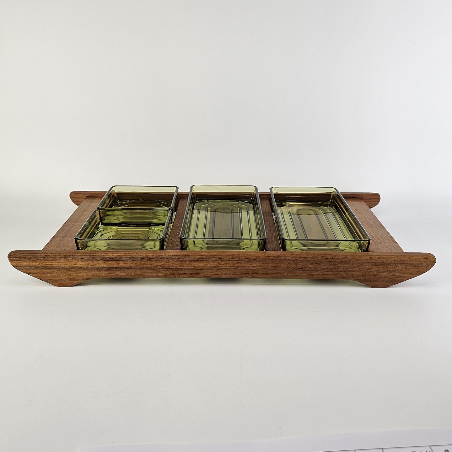 Cabaret fad i teaktræ med fire skåle af grønt presset glas i to forskellige størrelser