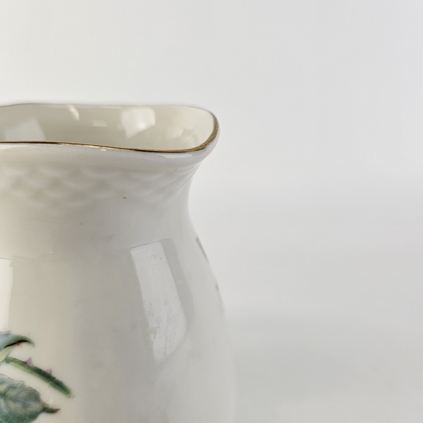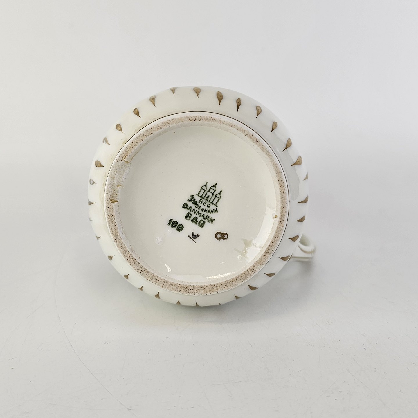 Balder er cremefarvet porcelæn i skælform, dekoreret med hyben og guldkant.