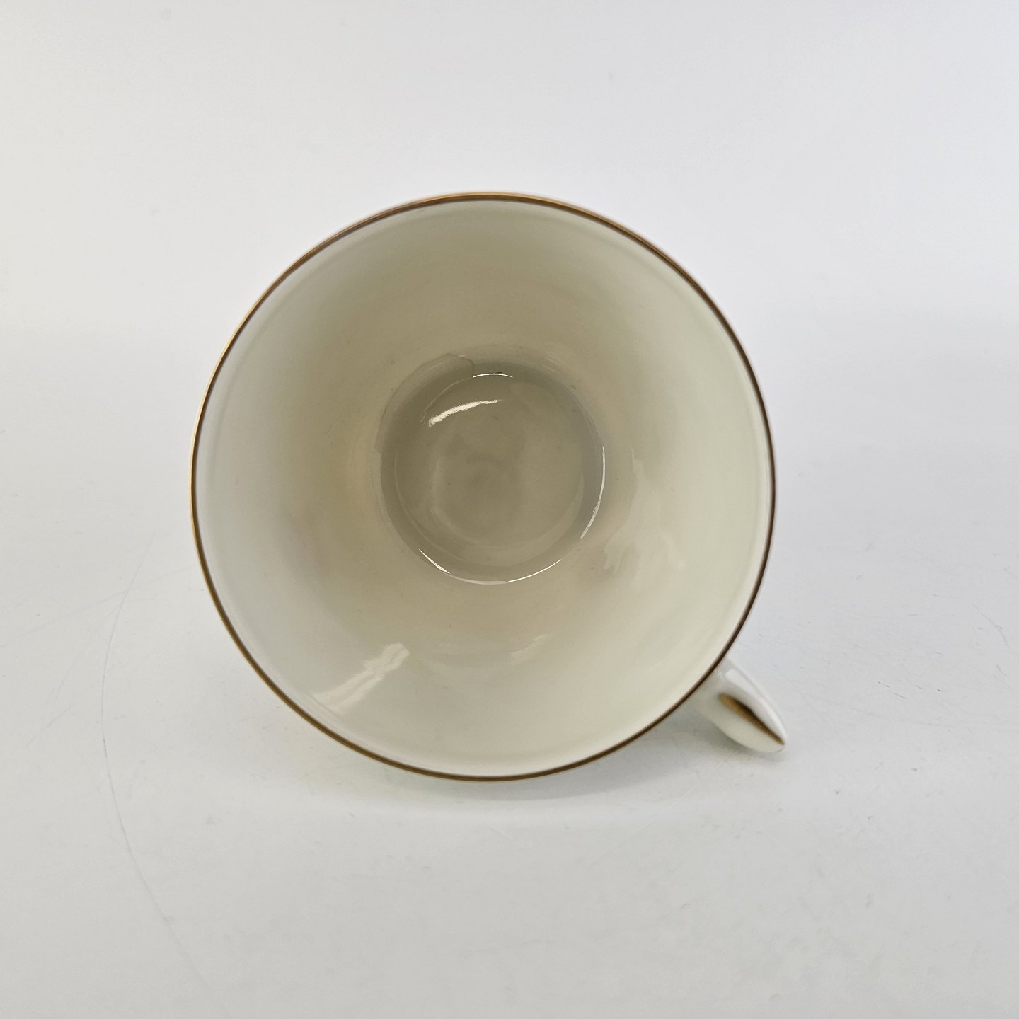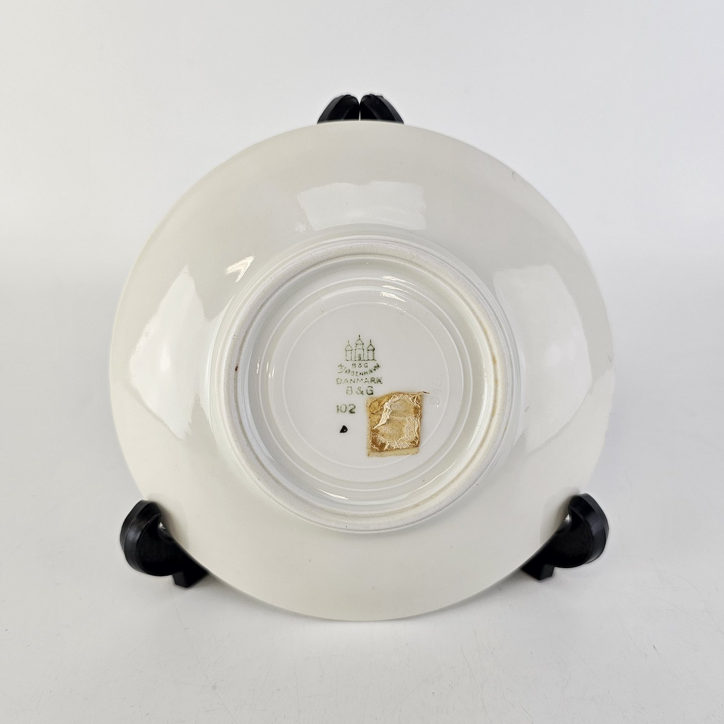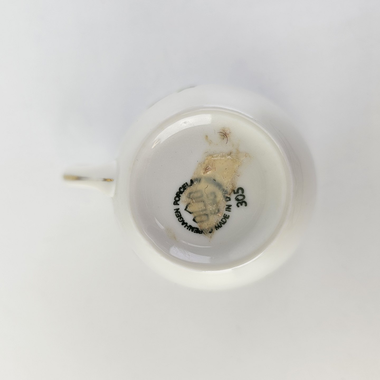 Balder er cremefarvet porcelæn i skælform, dekoreret med hyben og guldkant.