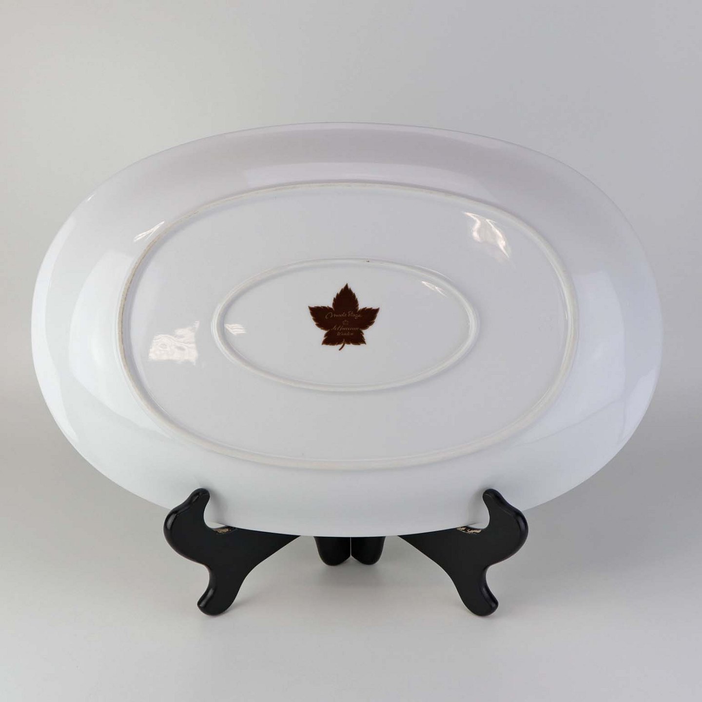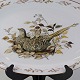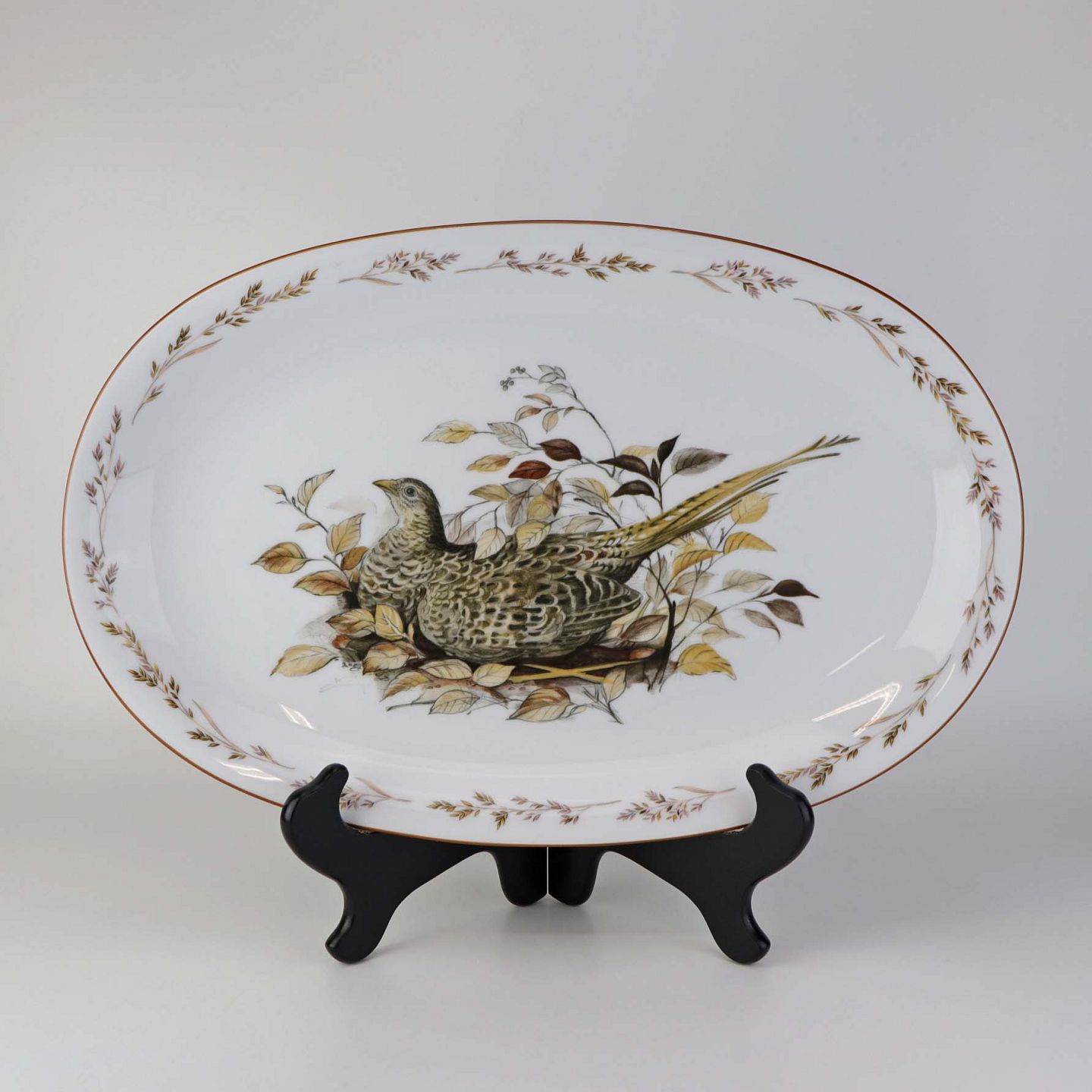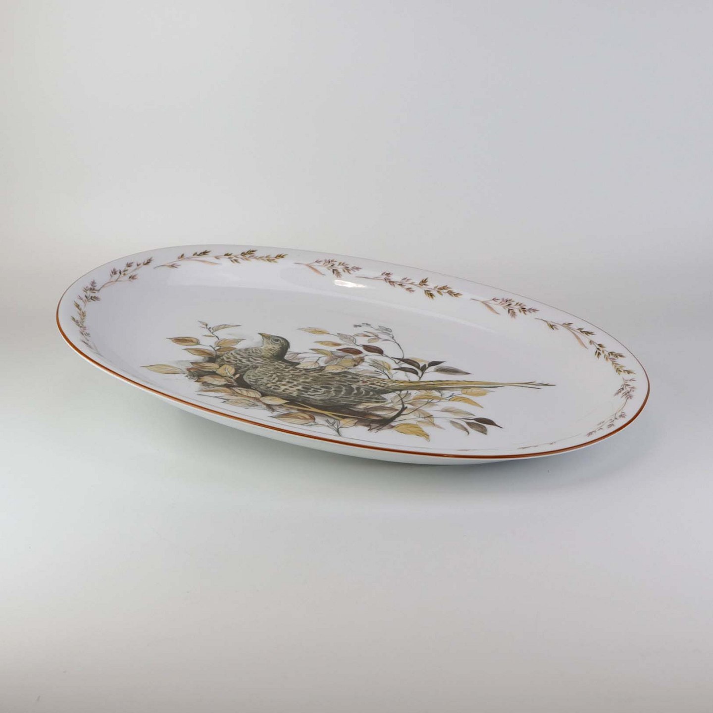 Ovalt serveringsfad i porcelæn med motiv af agerhøne på rede fra stellet Jagtstel. Nr. 38