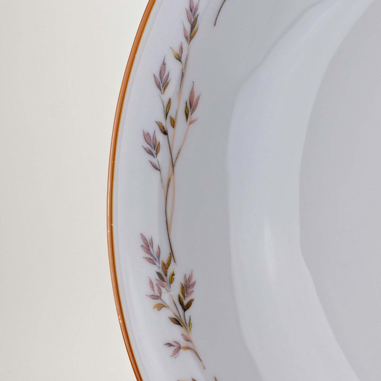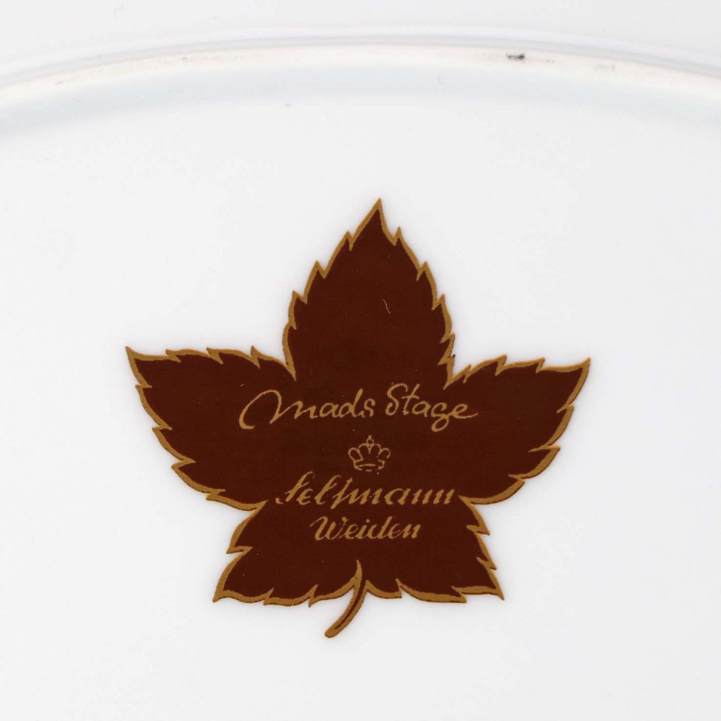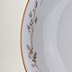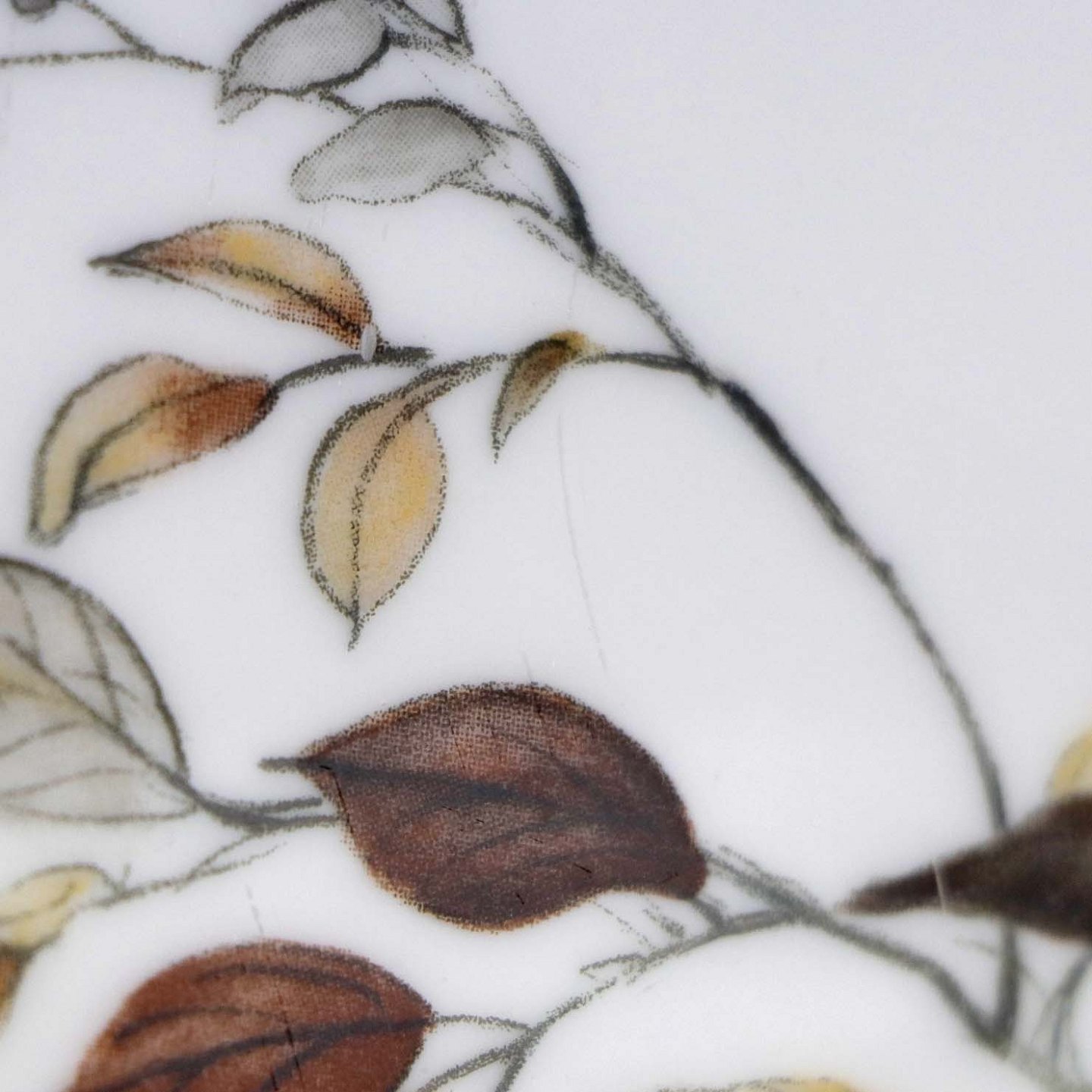Jagtstellet er i glat hvidt porcelæn med gyldenbrun kantdekoration og motiver af forskellige vilde danske dyr i deres naturlige miljø. Stellet er holdt i dæmpede varme efterårsfarver.