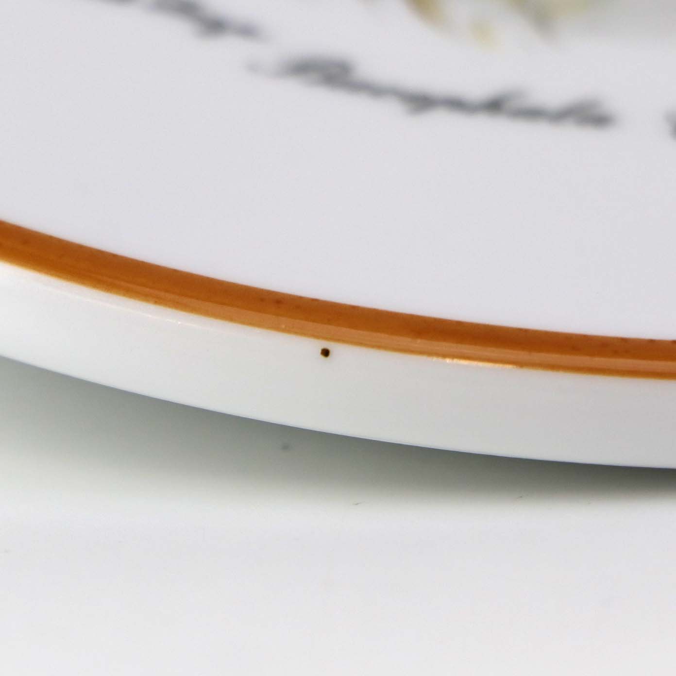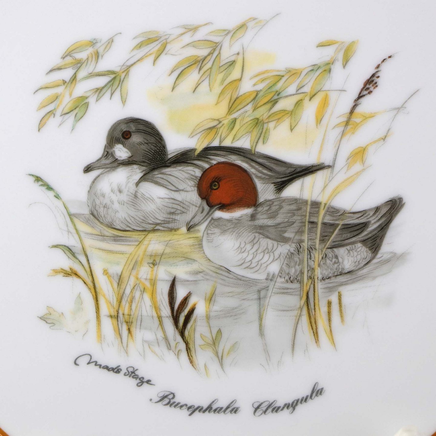 Rund smørbrik i porcelæn med forboret hul til ophæng og motiv af ænder fra stellet Jagtstel.