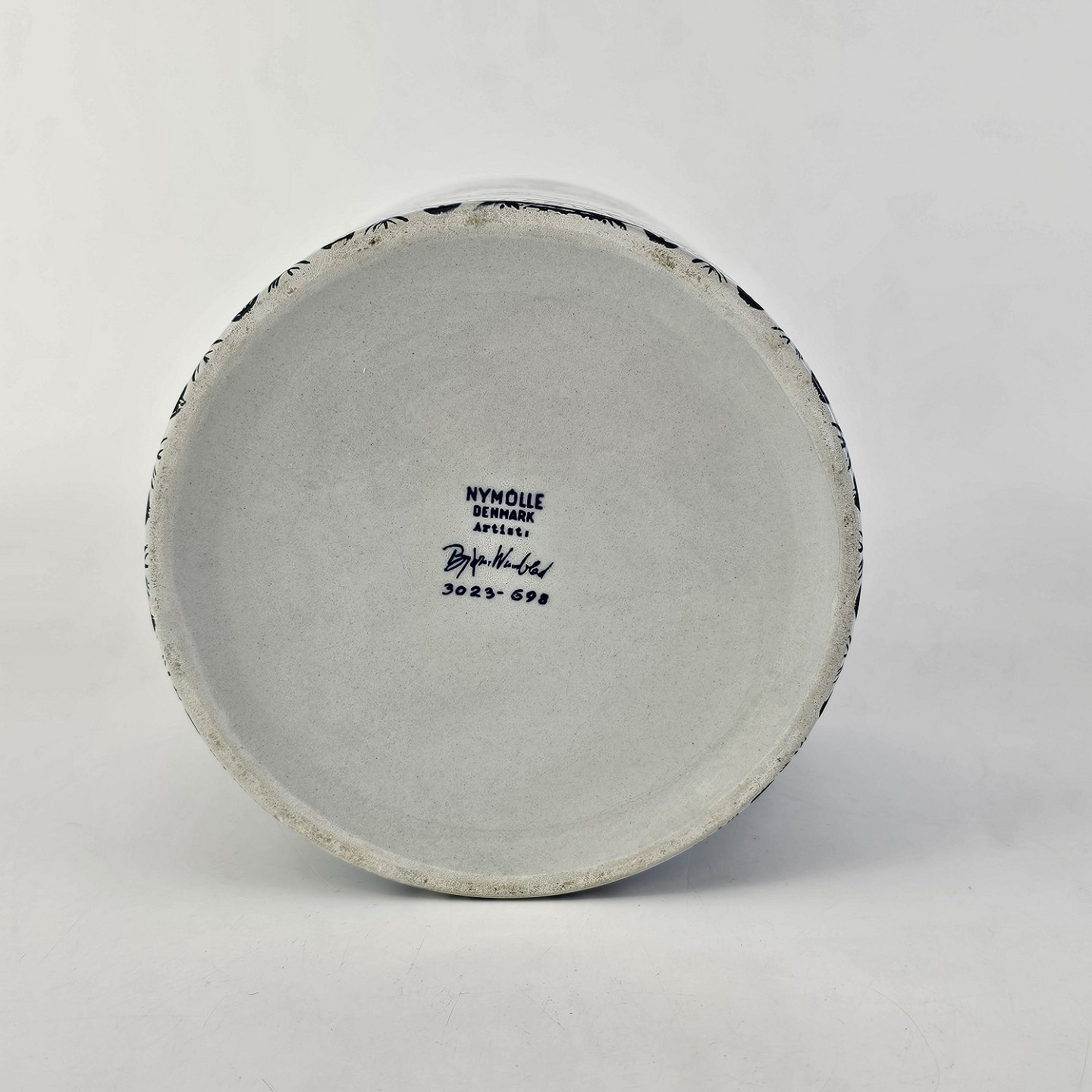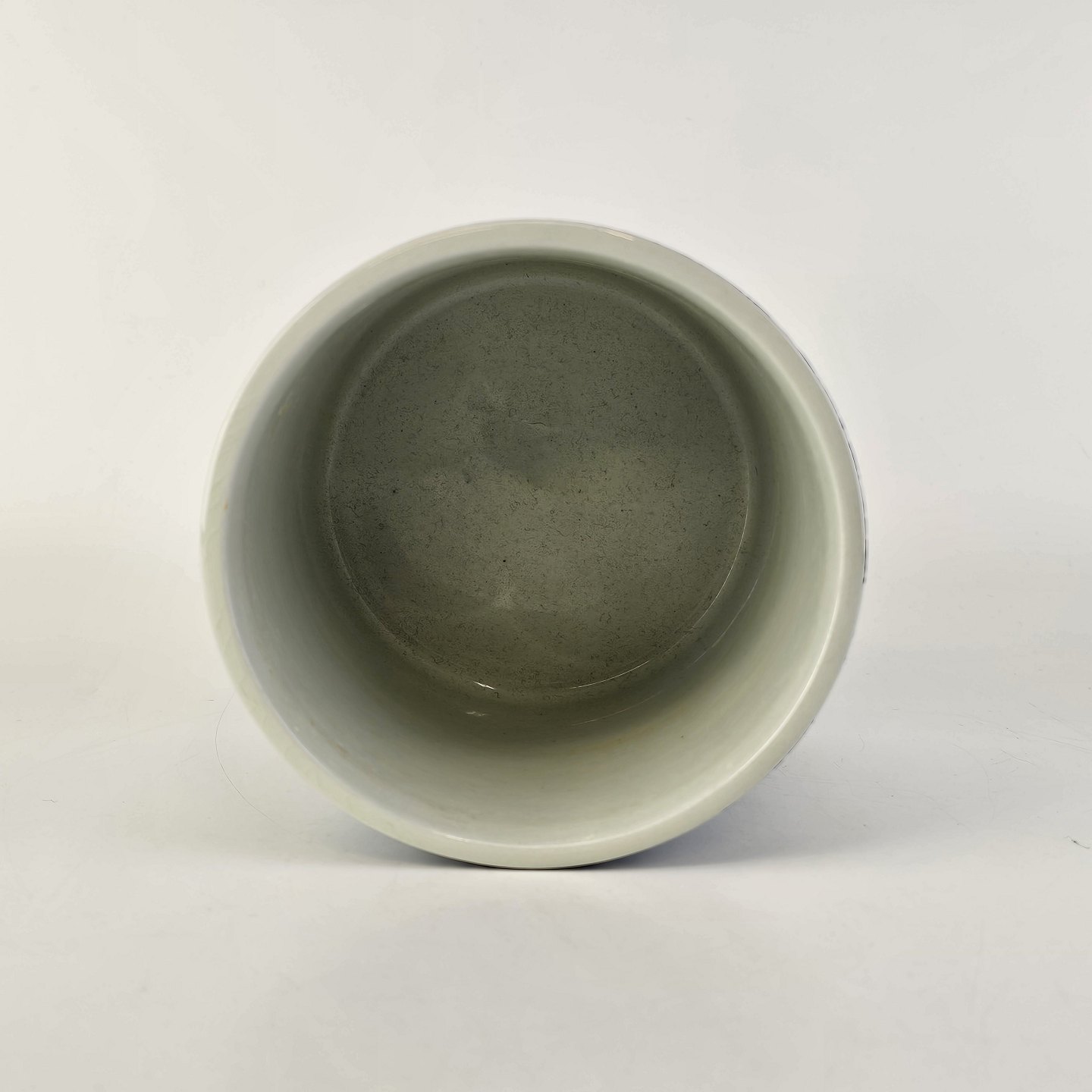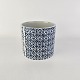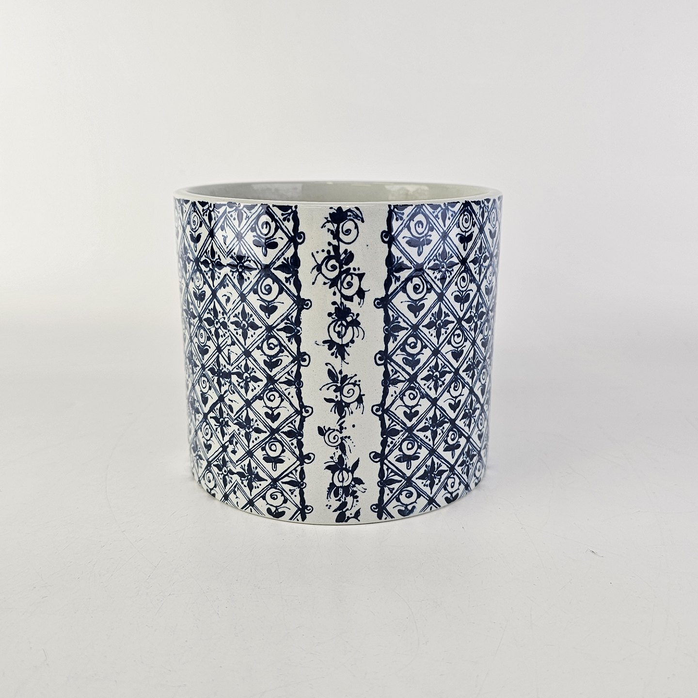 Urtepotteskjuler af porcelæn med et sort/hvidt mønster af en kvinde og blomster og teksten Koleriker