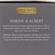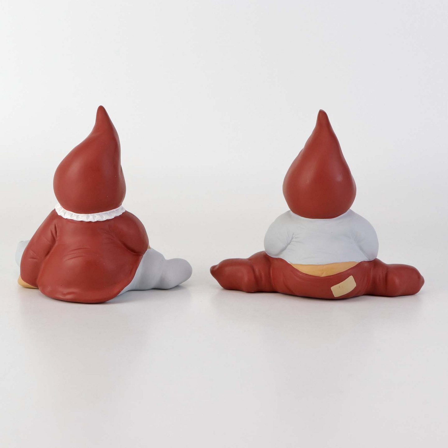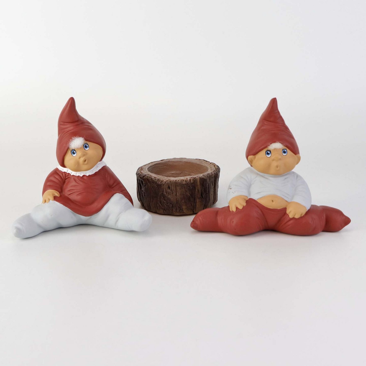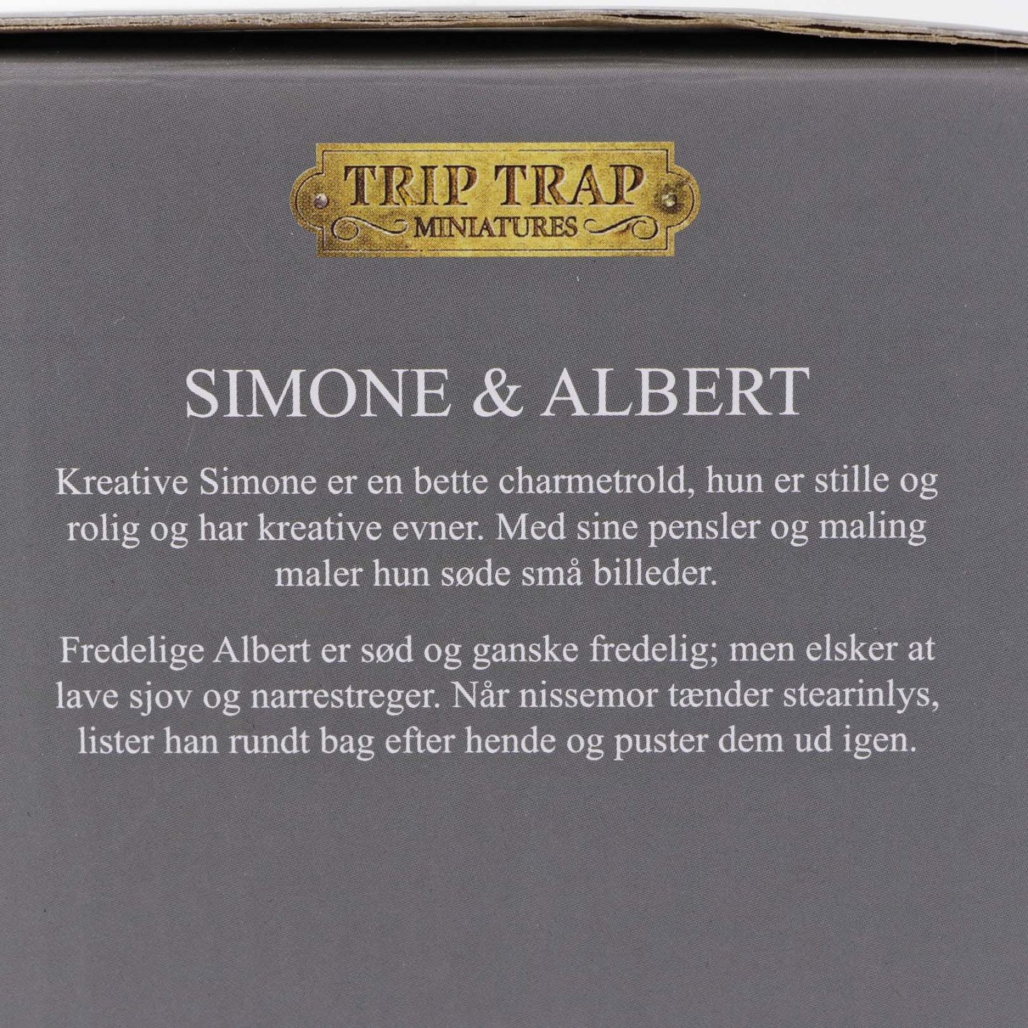 Figursæt med motiv af nisserne Simone og Albert med tilhørende fyrfadsstage fra serien Klarborg jul år 2021. Figurene kommer med original boks.