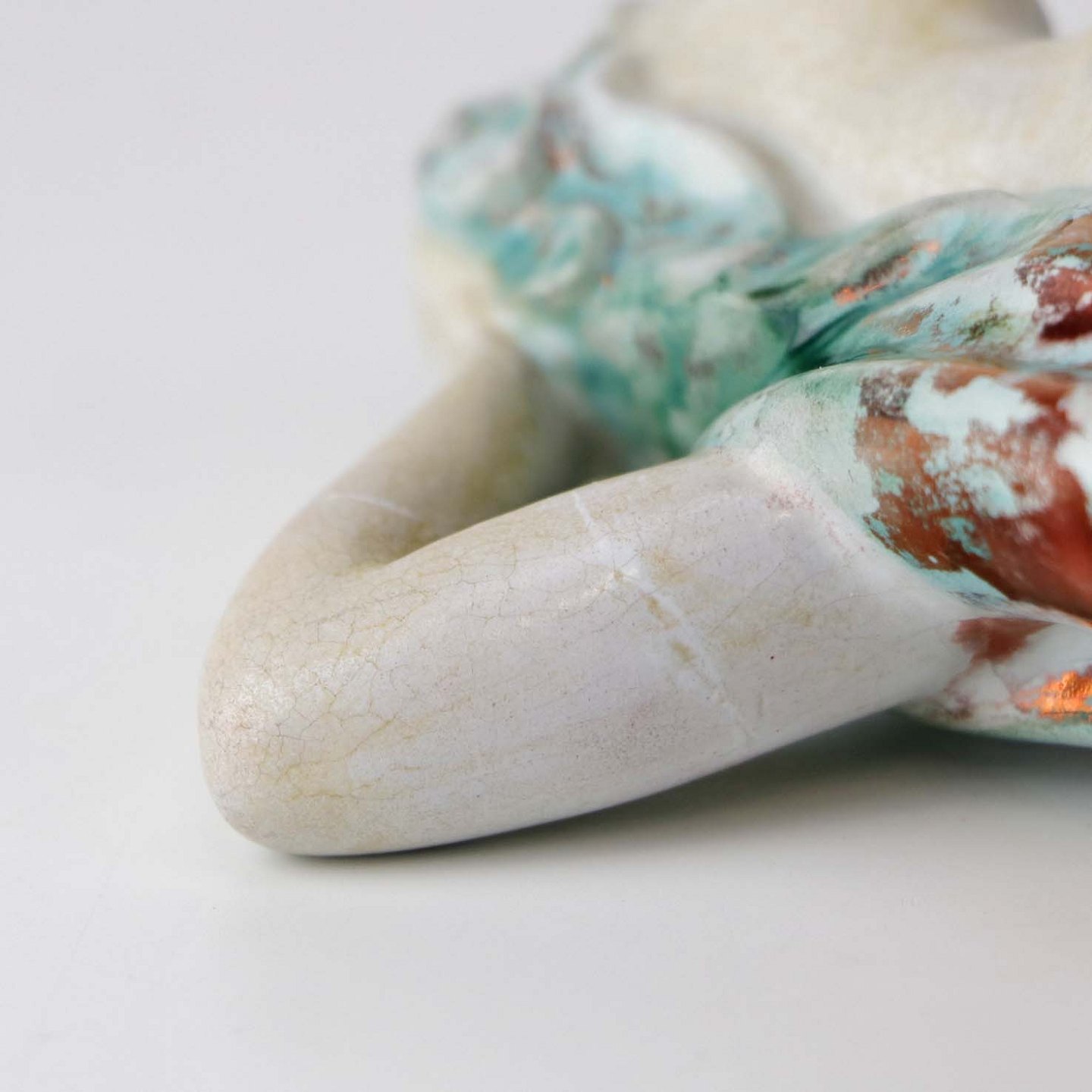 Fremstår med mindre brugsspor på kjolen, uregelmæssighed ved den ene arm samt mindre område på den ene fod med manglende glasur.