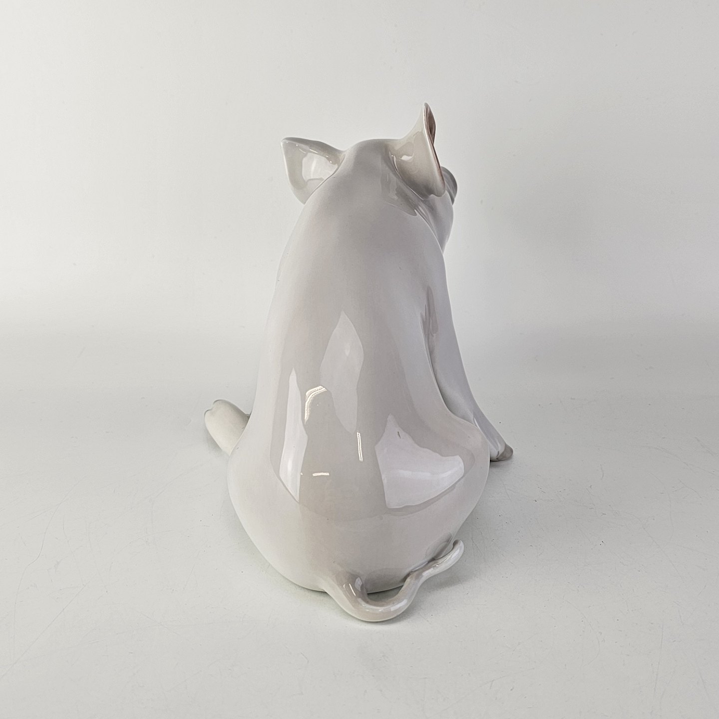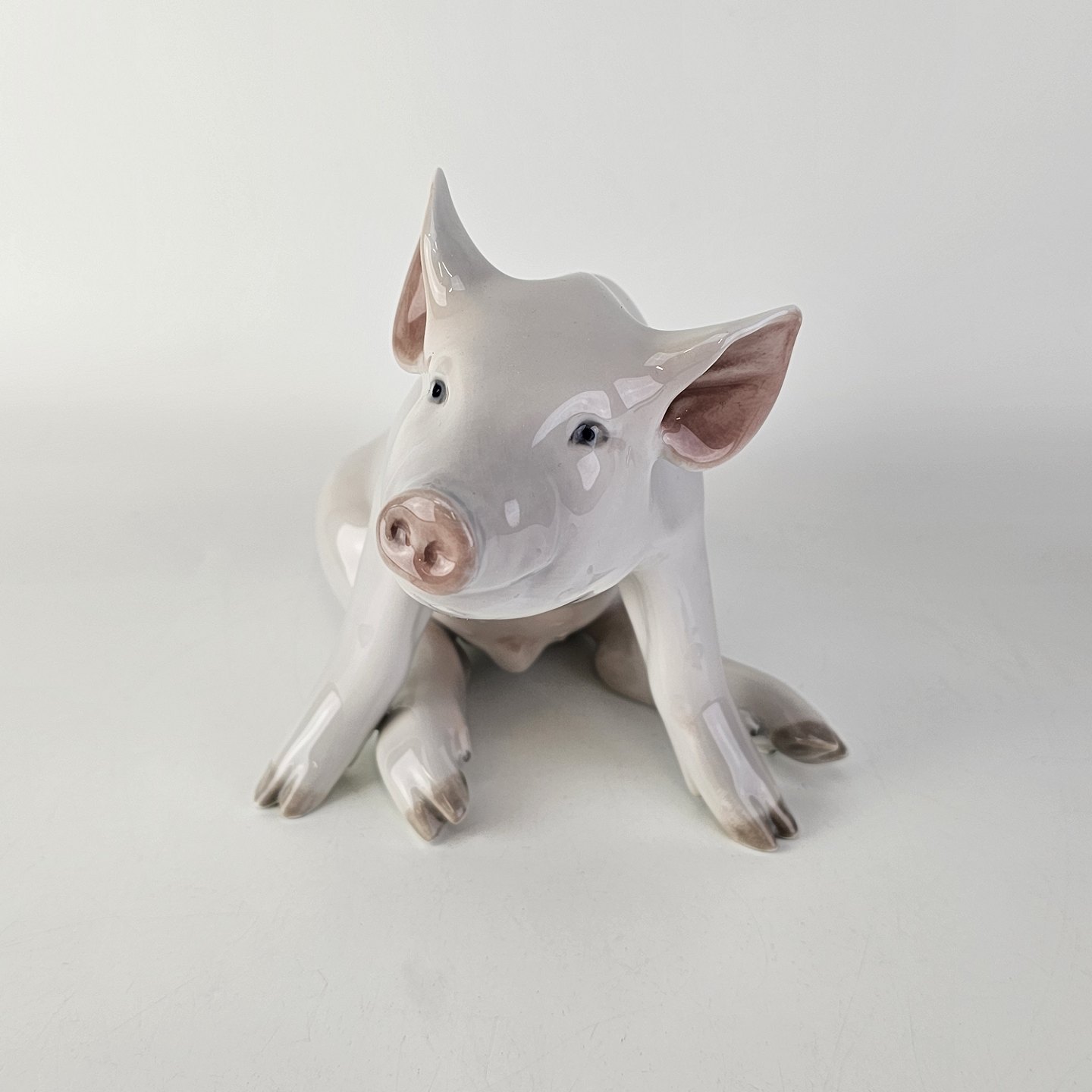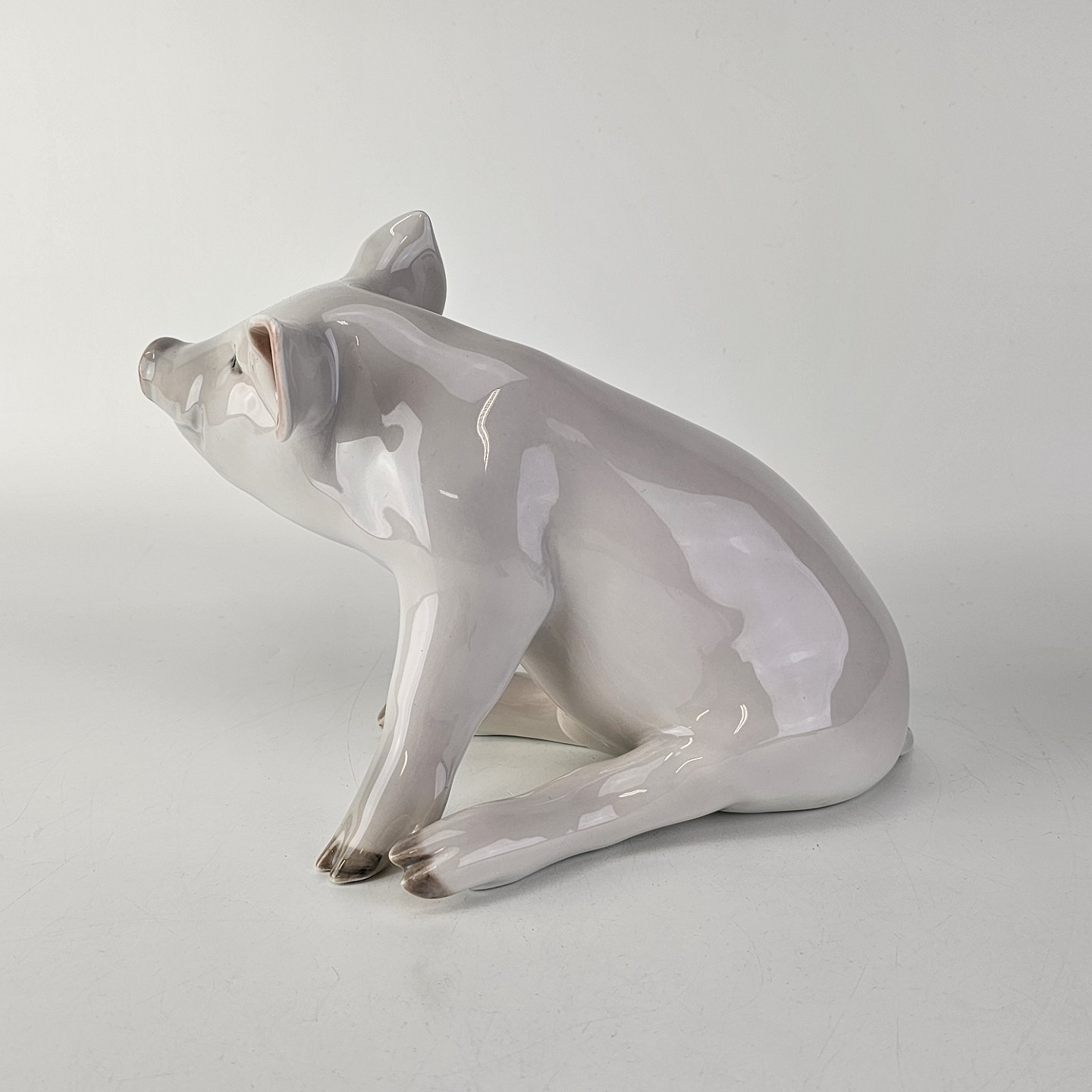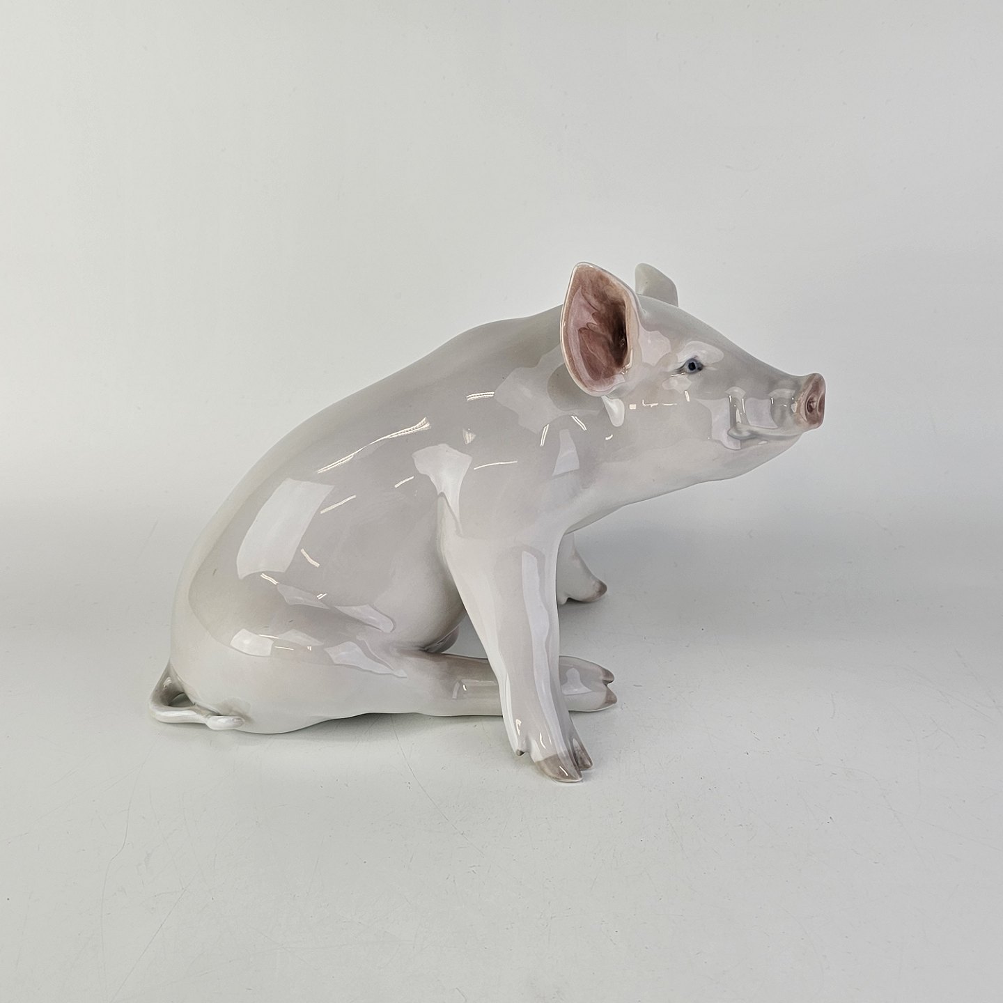 Figur i porcelæn med motiv af en siddende gris