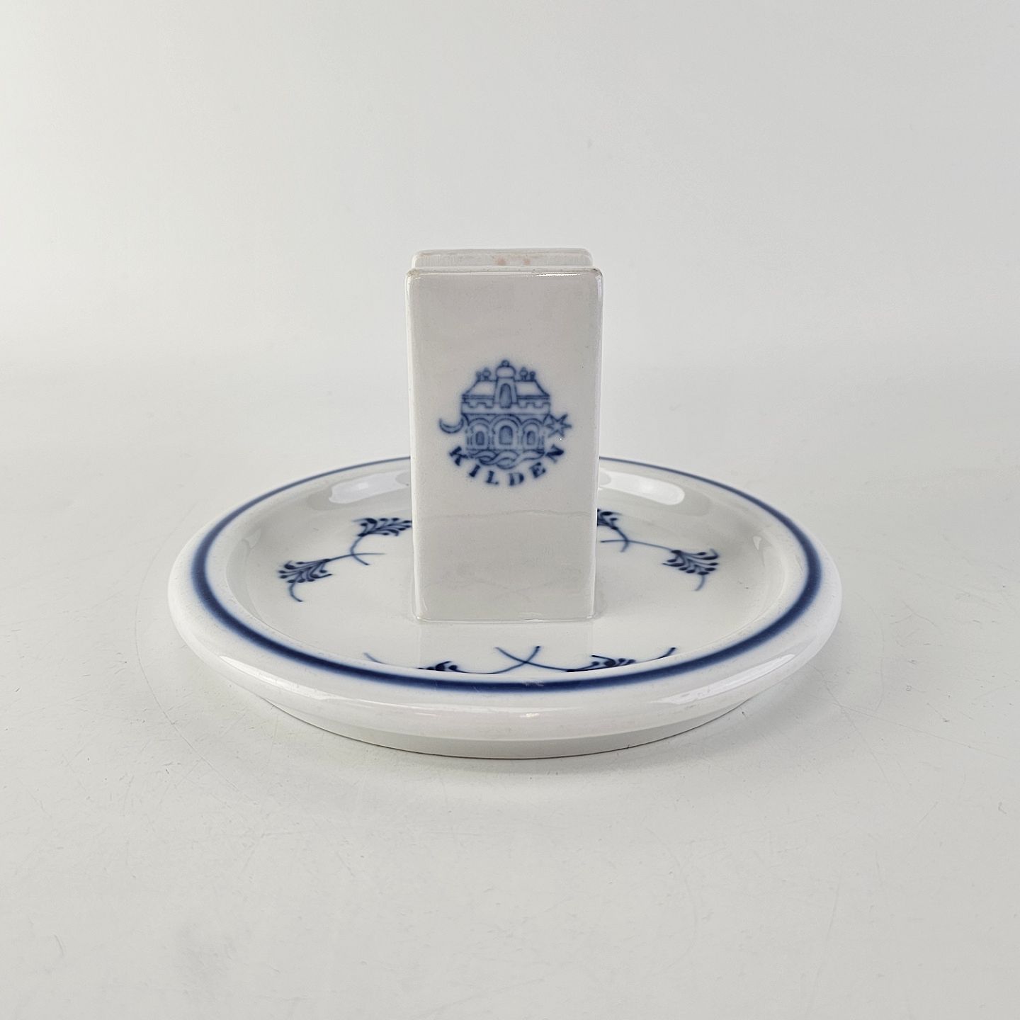 Tandstikkeholder i hotelporcelæn med motiv fra restaurant Kilden i Aalborg fra stellet Blåmalet