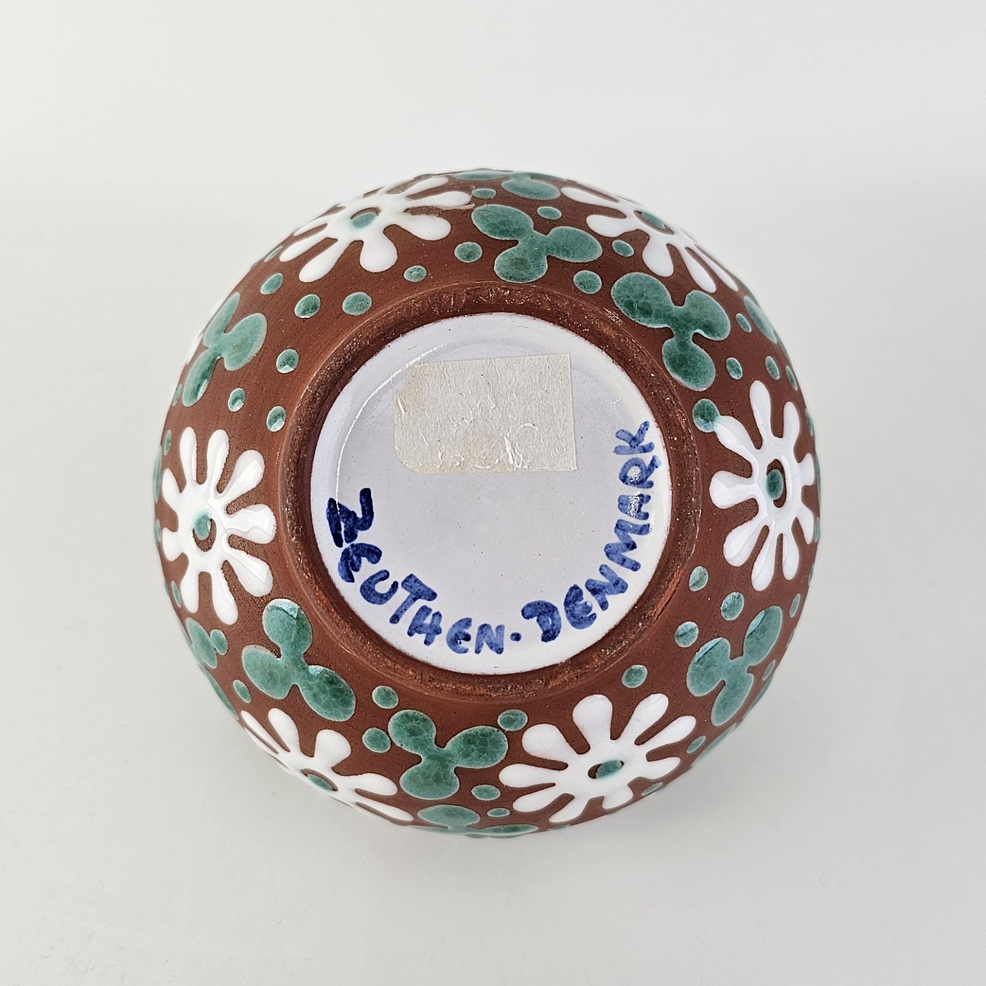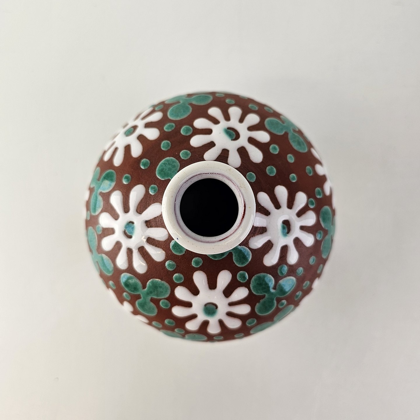 Vase i keramik med brun glasur og dekoration af hvide blomster og blågrønne blade