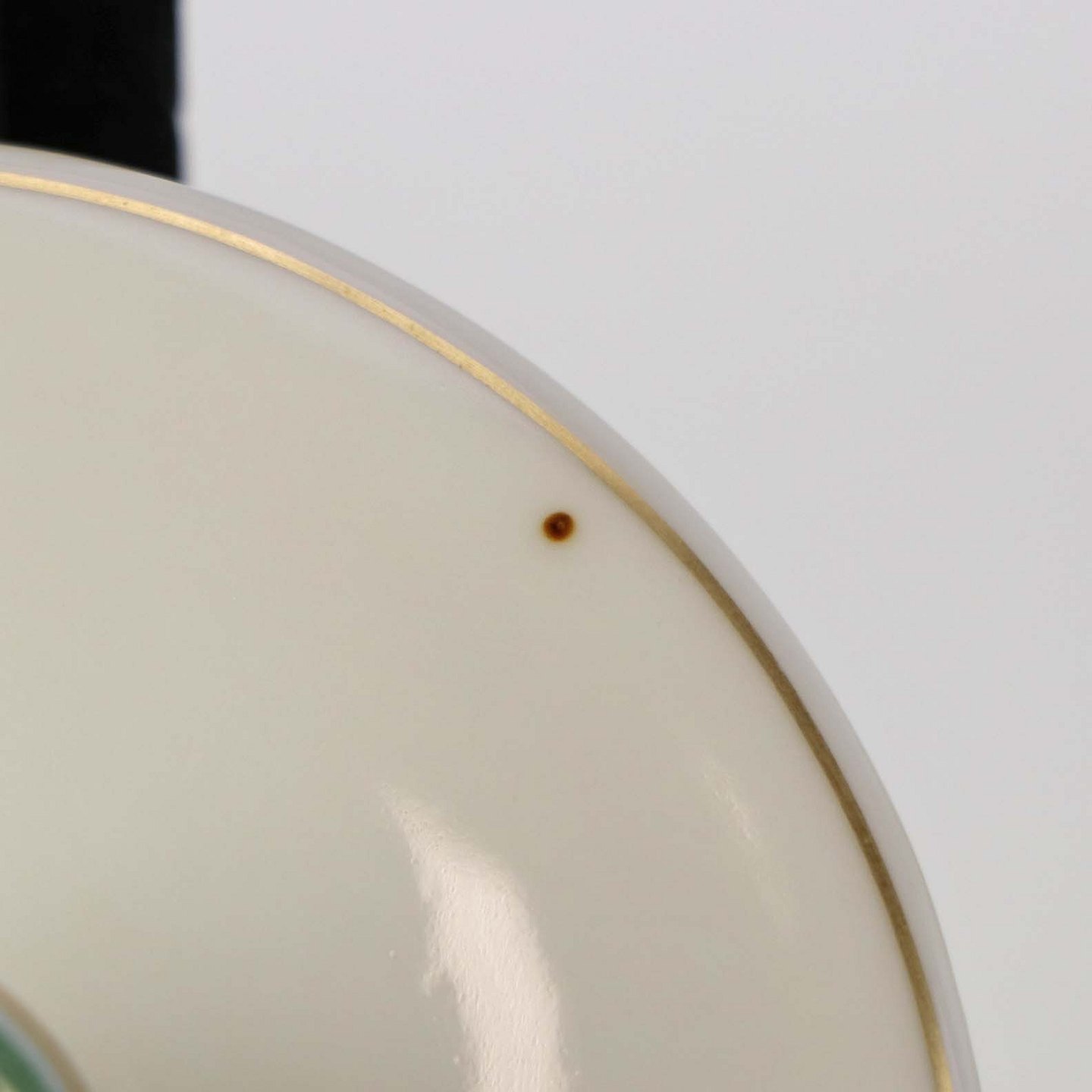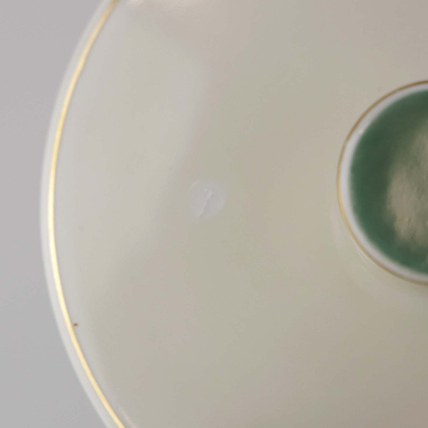 Fremstår med brunt plet under glasuren samt ujævnhed i porcelænet på låget samt mindre brugsspor ved tud.