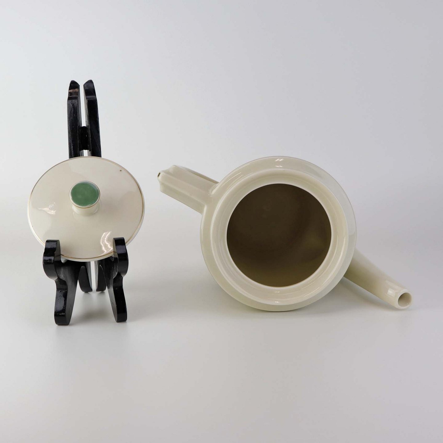 Stel i glat råhvidt porcelæn dekoreret med lysegrøn stribe og guldkant samt motiv af hjertegræs.