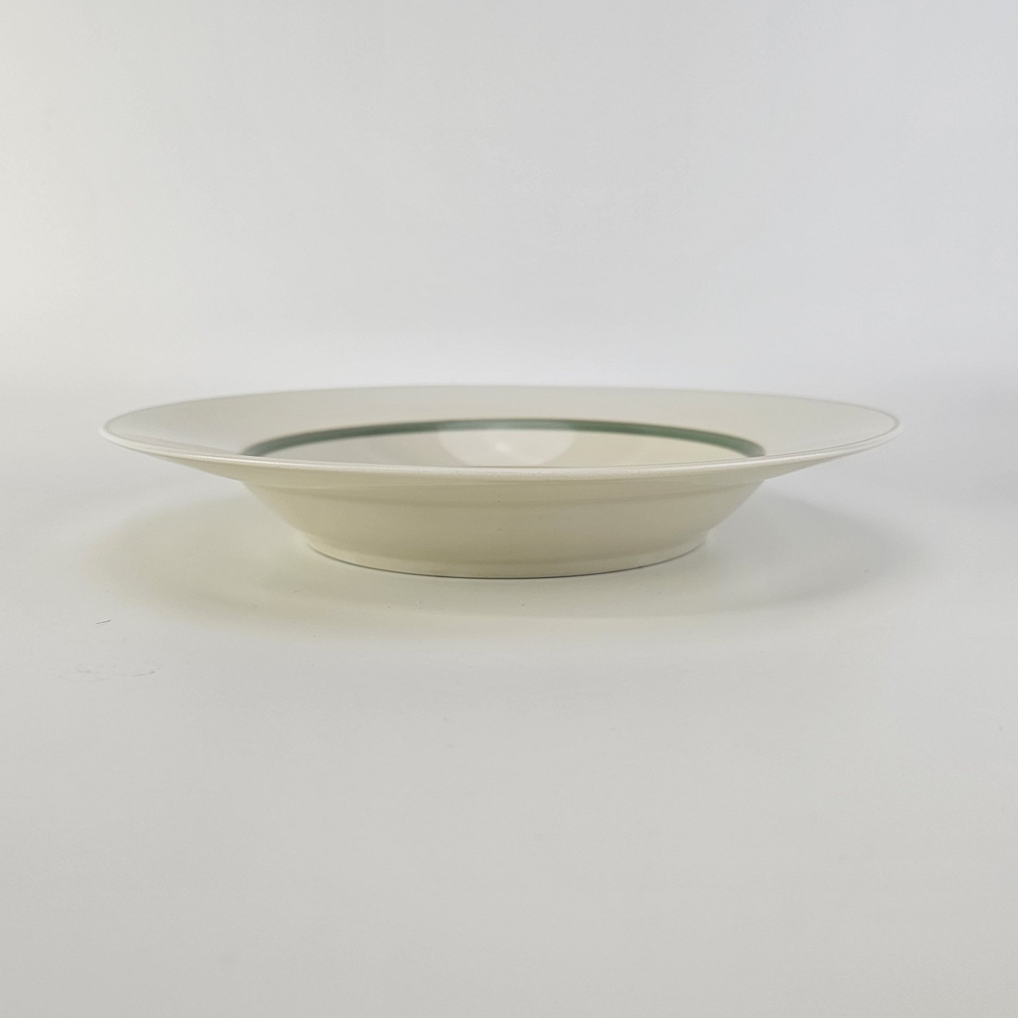 Stel i glat råhvidt porcelæn dekoreret med lysegrøn stribe og guldkant samt motiv af hjertegræs.
