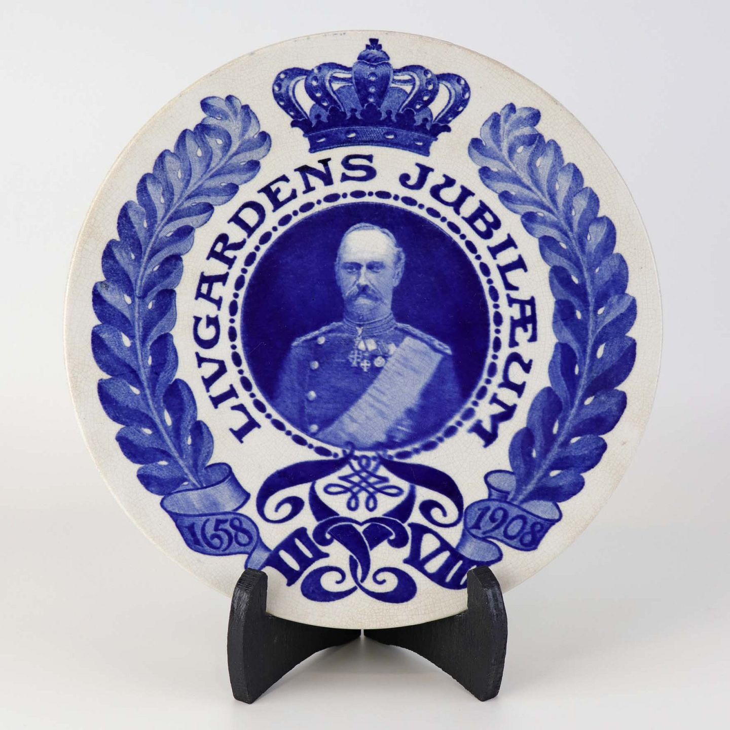 Platte i fajance, som blev udgivet i forbindelse med Livgardens 250 års jubilæum med teksten Livgardens jubilæum år 1658-1908 og motiv af Kong Frederik VIII
