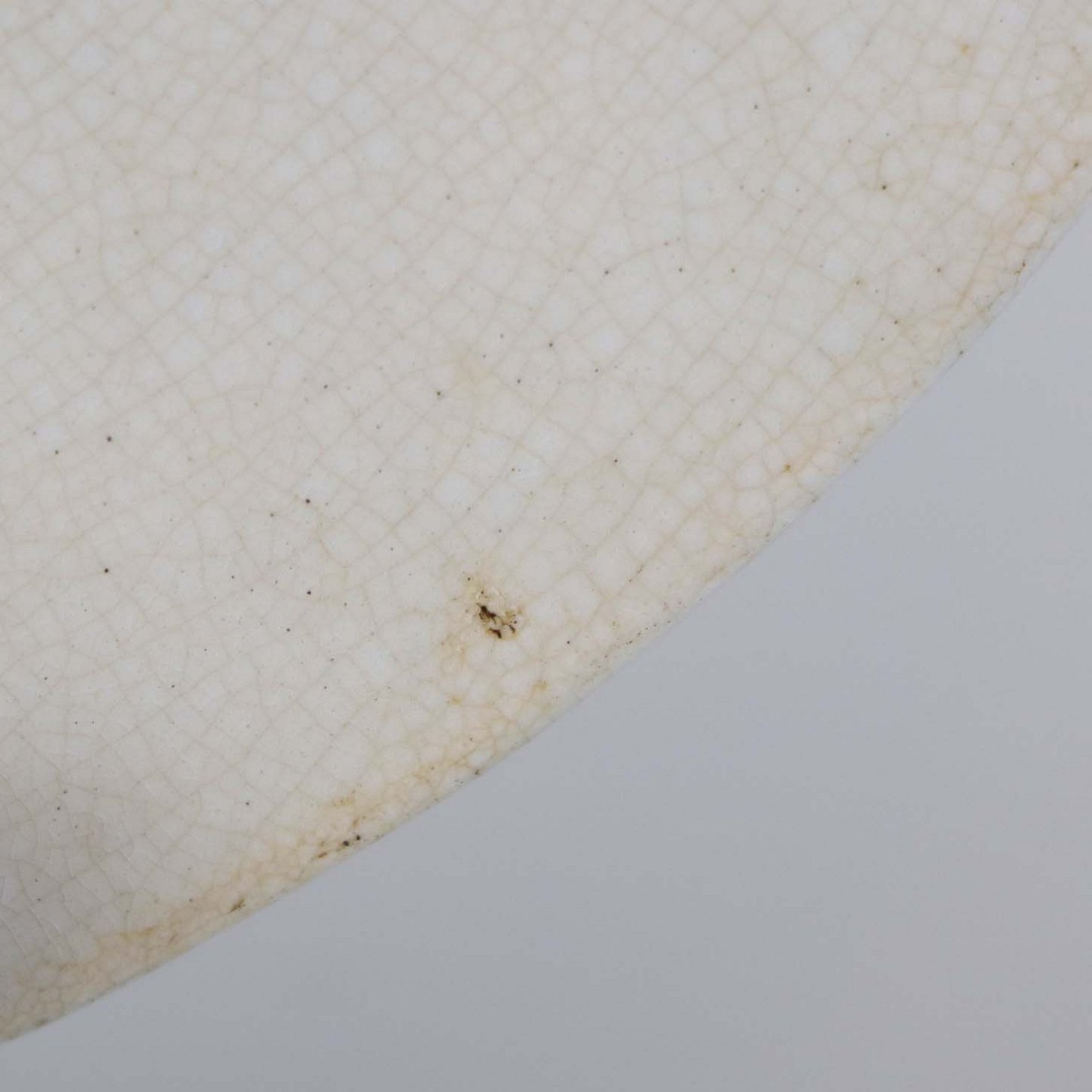 Fremstår med krakkeleringer i glasuren, letttere mørkninger langs kanten og på bagsiden.