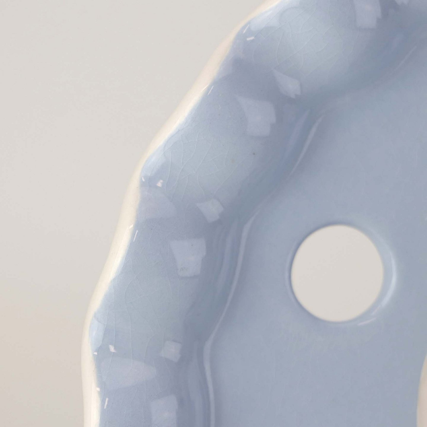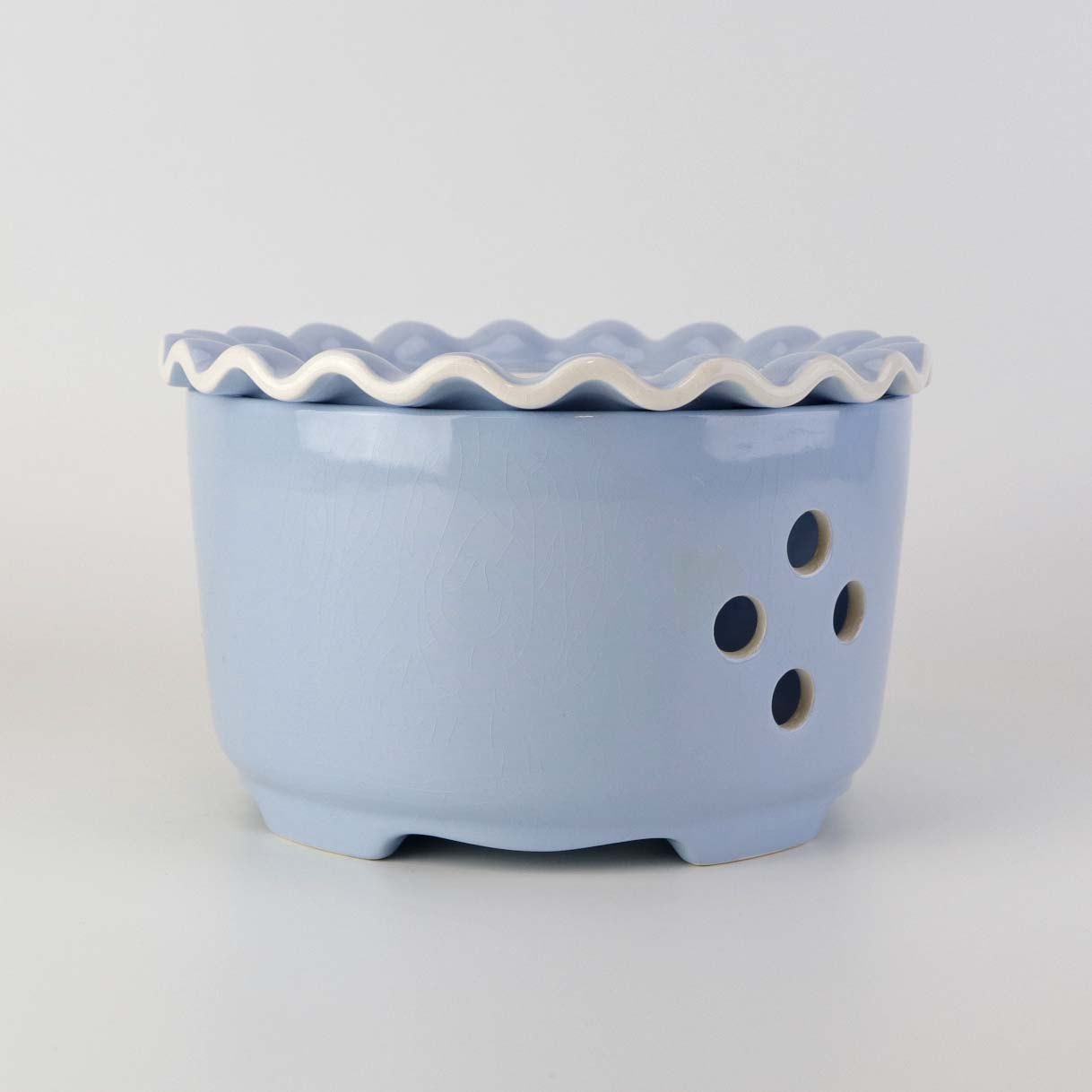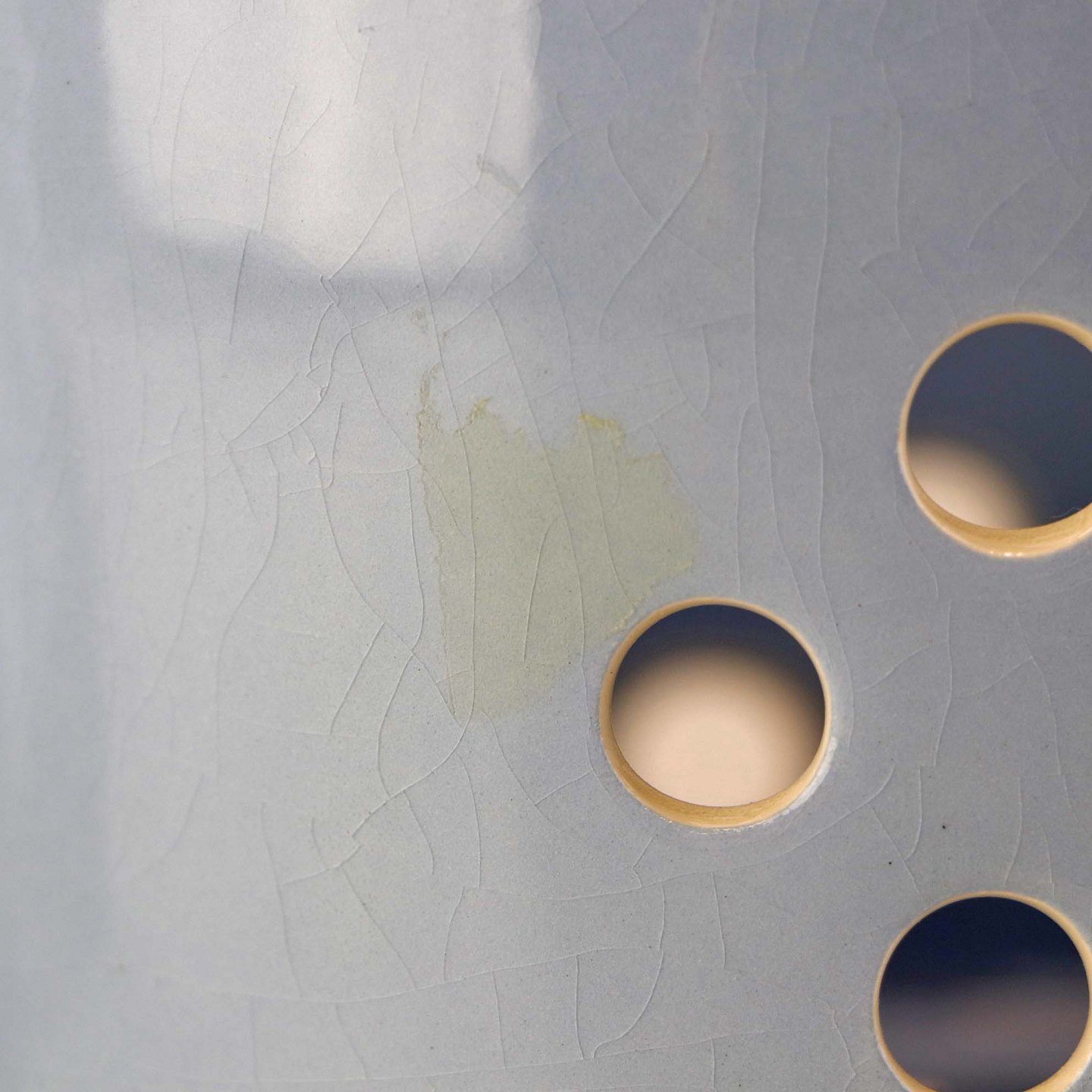 Fremstår med krakkeleringer i glasuren, mindre rest af tape, ujævnhed i glasuren under topfladen samt brugsspor på topkanten.