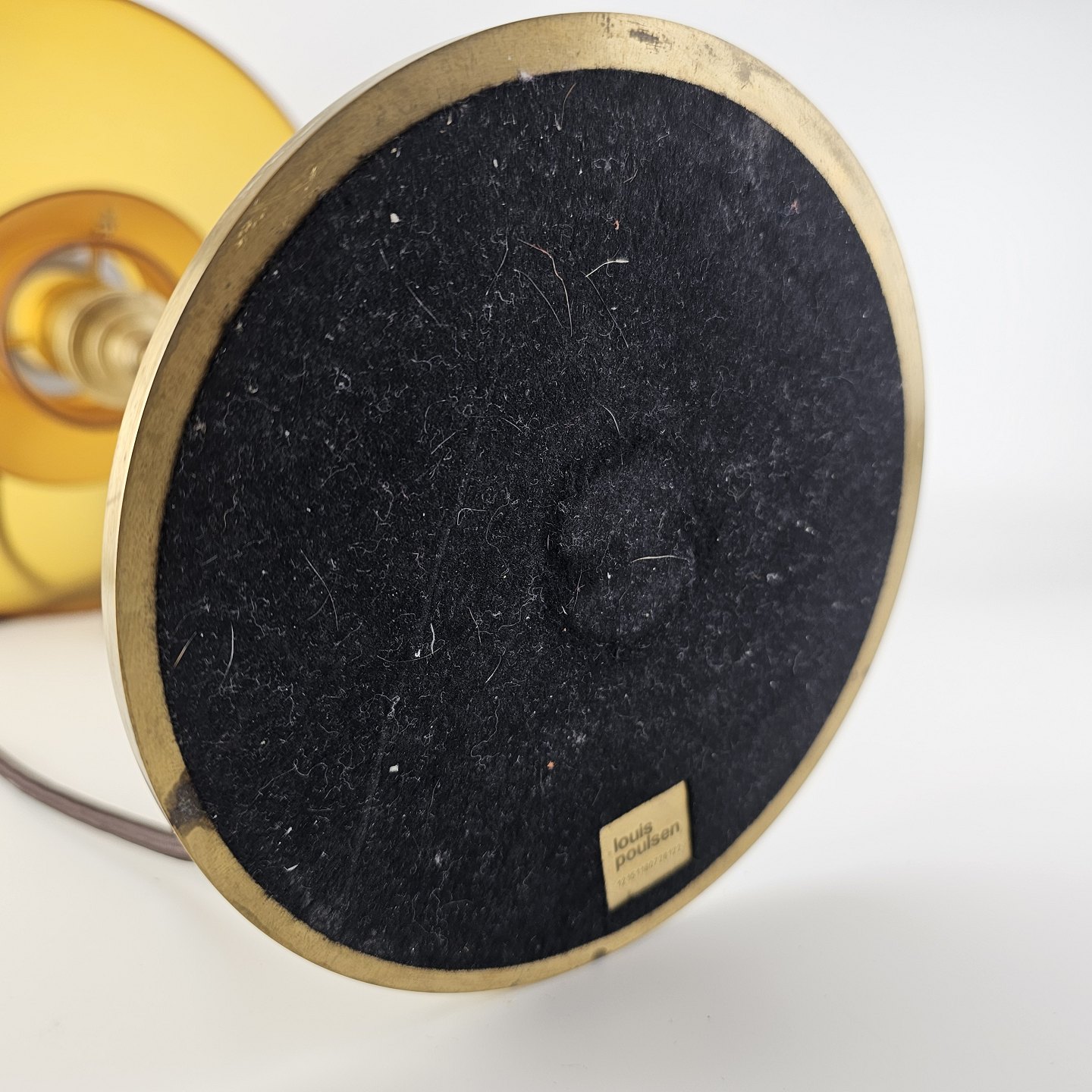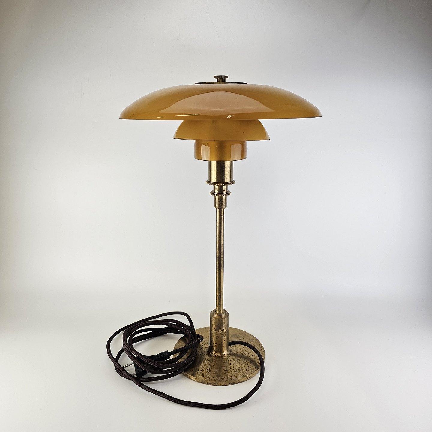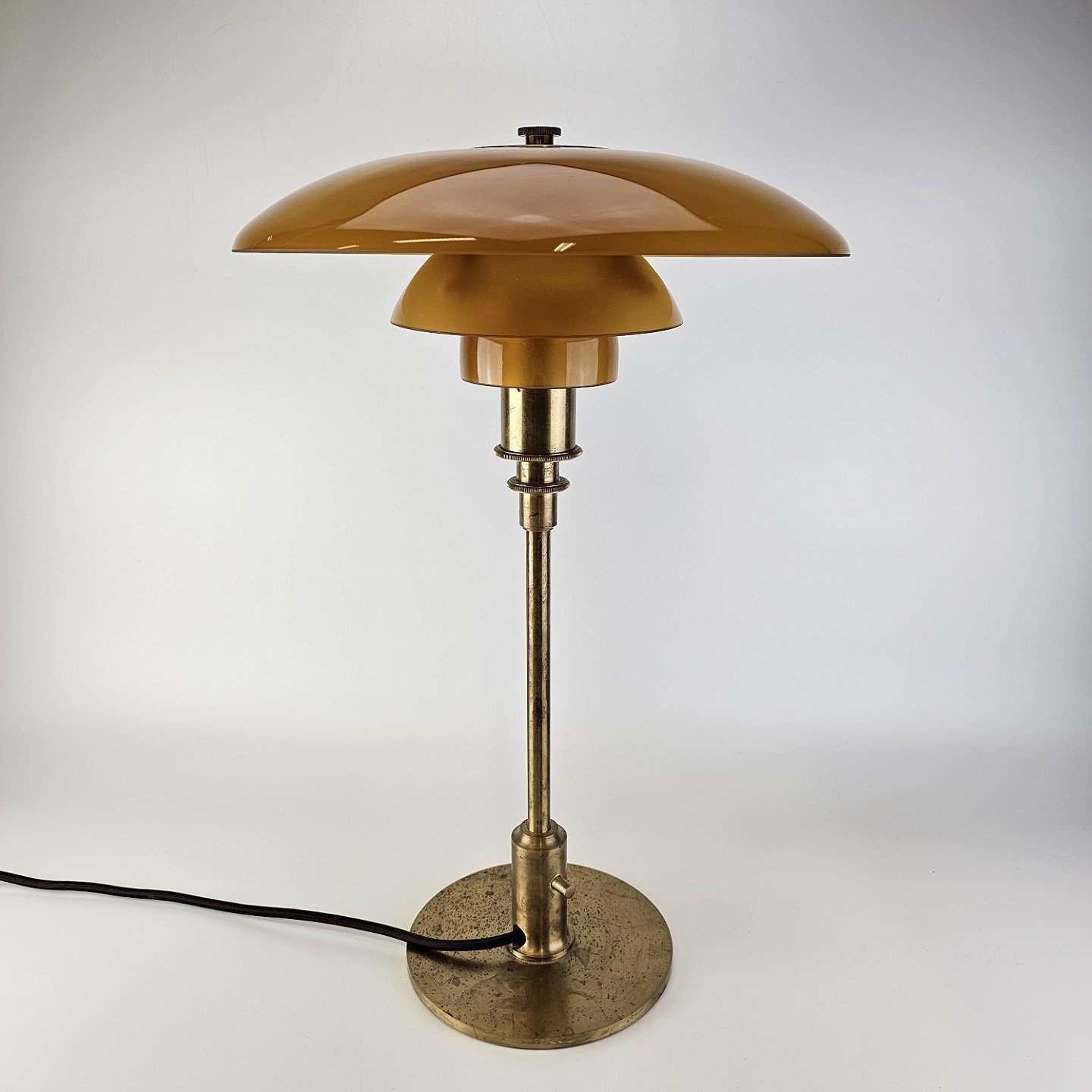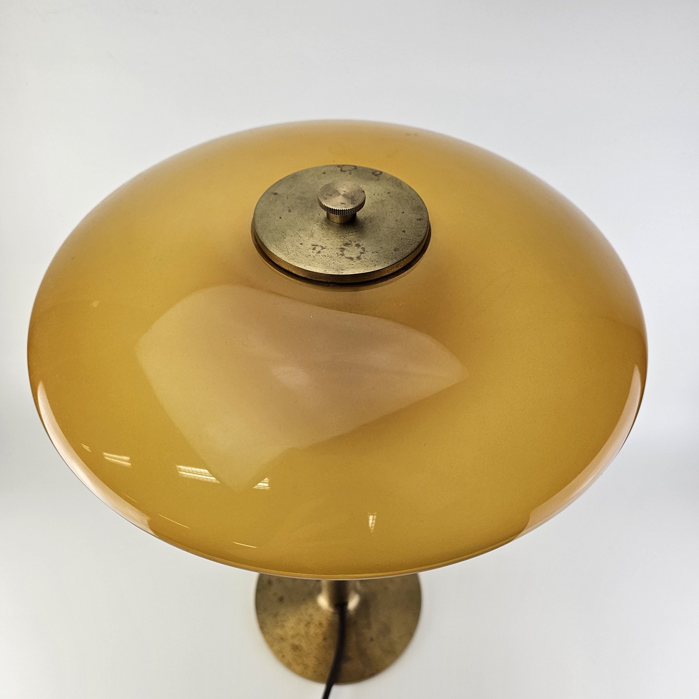 Bordlampe med skærm af mundblæst ravfarvet etlagsglas og fod af strøgslebet messing Limited edition udført efteråret 2018