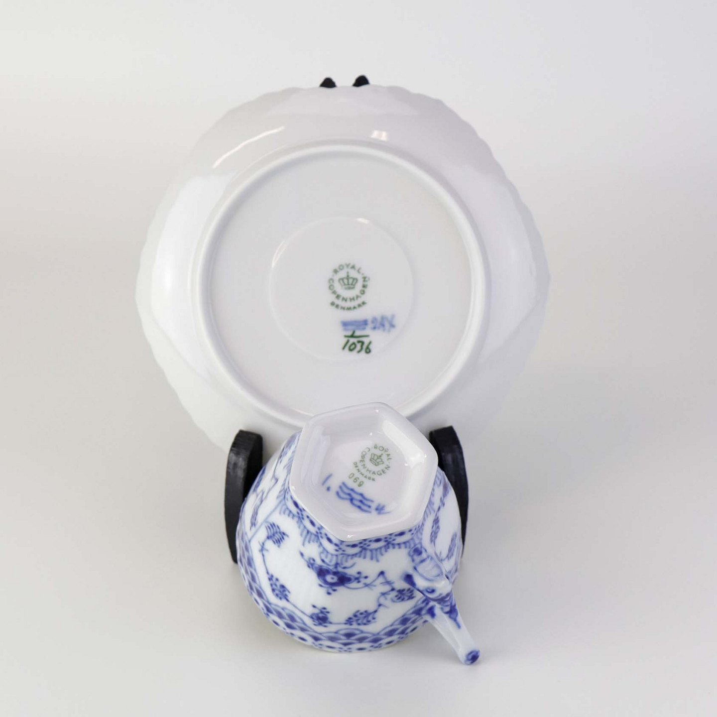 Kaffekop med underkop i kongeligt porcelæn fra stellet Musselmalet Helblonde. Nr. 069 og 1/1036