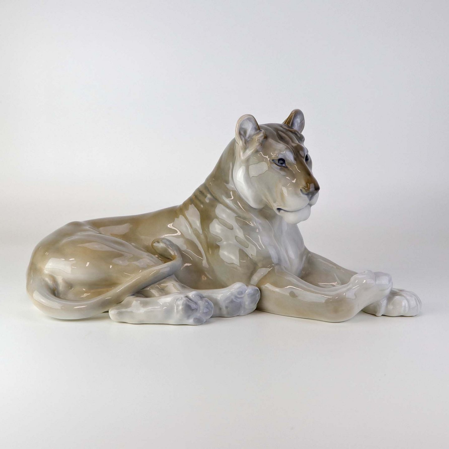 Figur i porcelæn med motiv af hvilende løvinde. Nr. 804