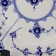 Musselmalet halvblonde er riflet hvidt porcelæn med dekoration af blå ranker og en kant med blonder.