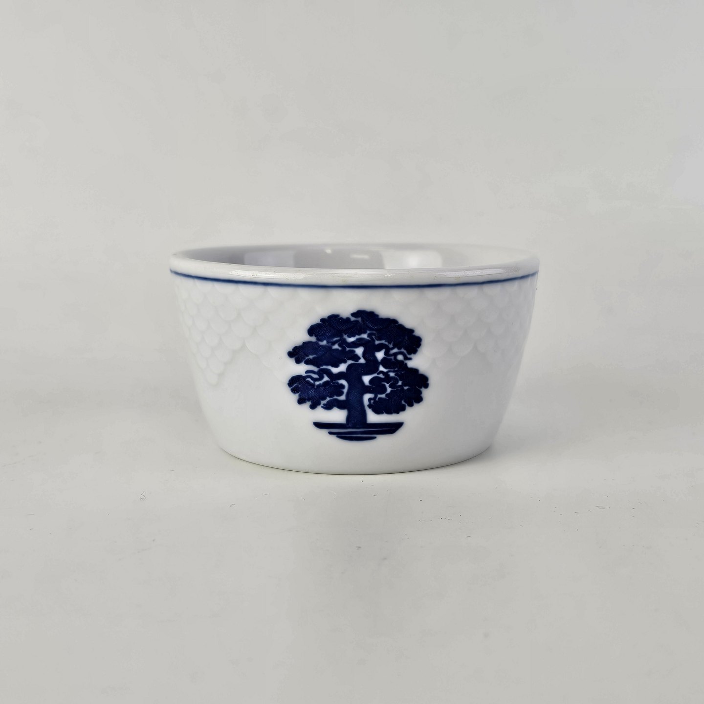 Hotelporcelæn Egetræ er hvidt og dekoreret med en blå streg og et blåt egetræ i midten