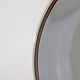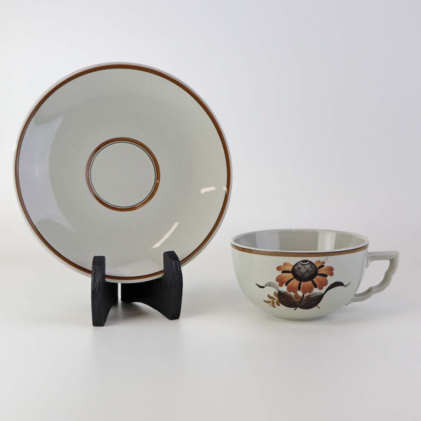 Fajancestellet er i stelformen Viktoria II med dekoration af orangebrune blomster på gråtonet baggrund med brun kant.