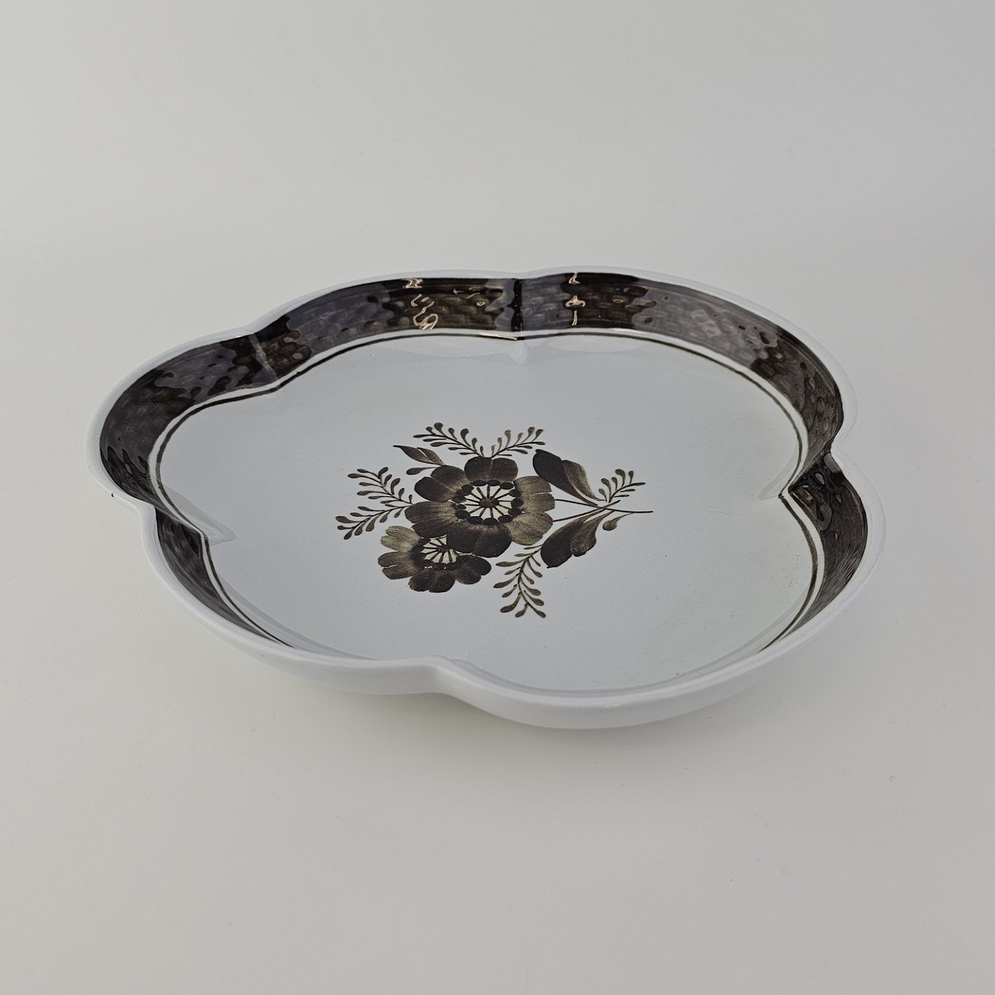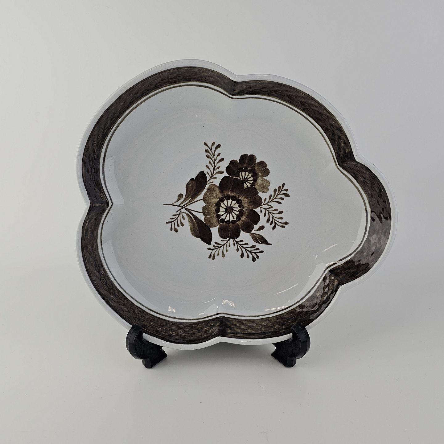 Fajancestellet med flettet kant og dekoration af brune blomster på lys baggrund med brun kant