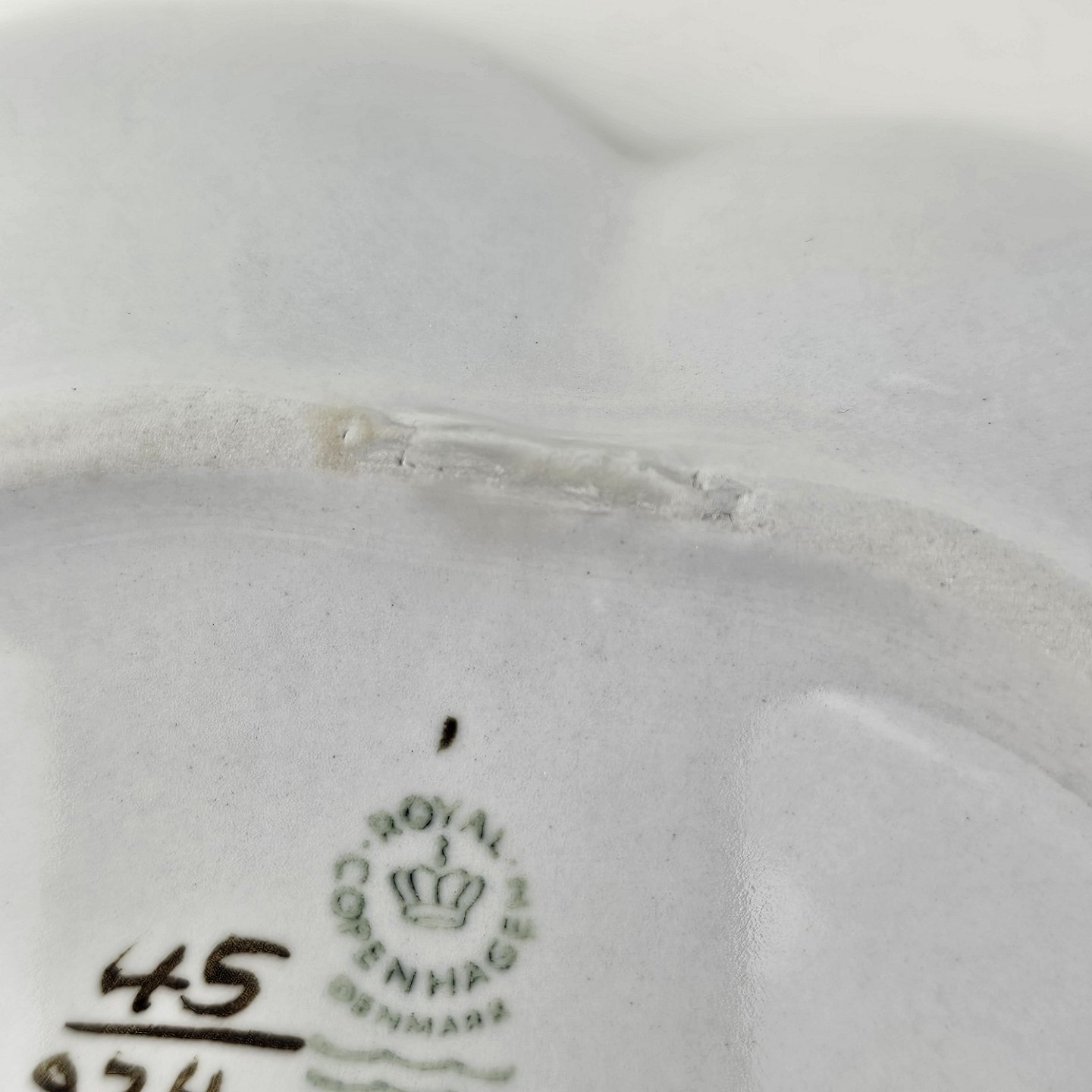 Fremstår med reparation og en prik på kanten