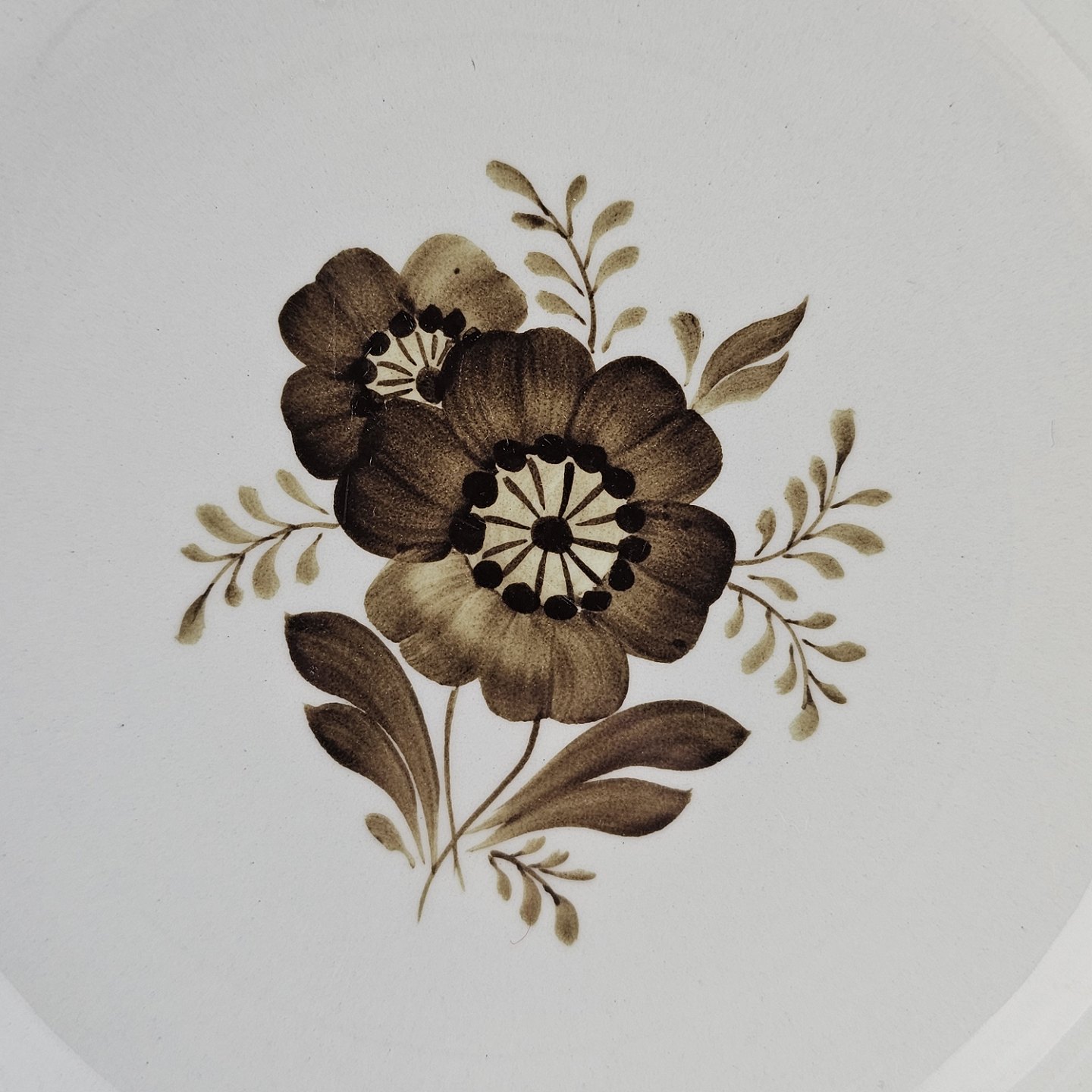 Fajancestellet med flettet kant og dekoration af brune blomster på lys baggrund med brun kant