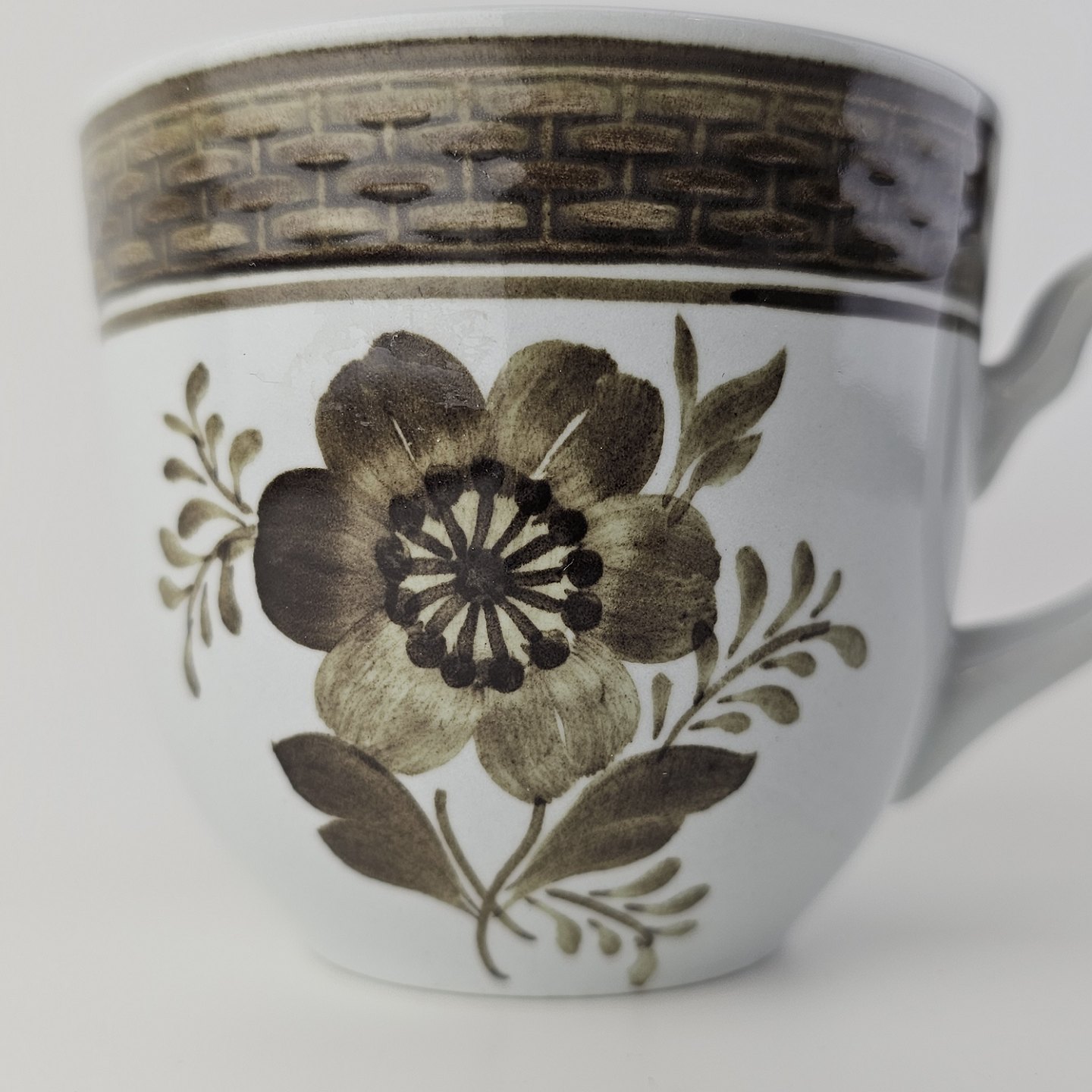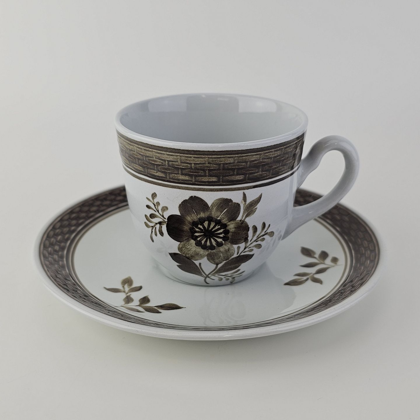 Fajancestellet med flettet kant og dekoration af brune blomster på lys baggrund med brun kant