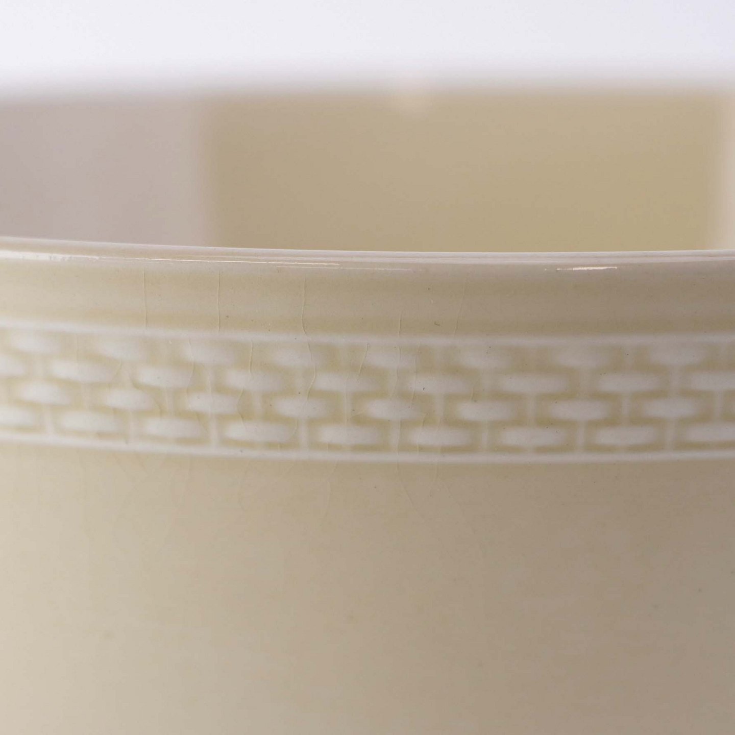 Sandfarvet fajancestel i stelform Viktoria II - Fletværk med dekoration af hvidt flet på gullig baggrund.