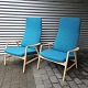 Sæt af to lænestole med træstel og sæde betrukket i blå Hallingdal uld