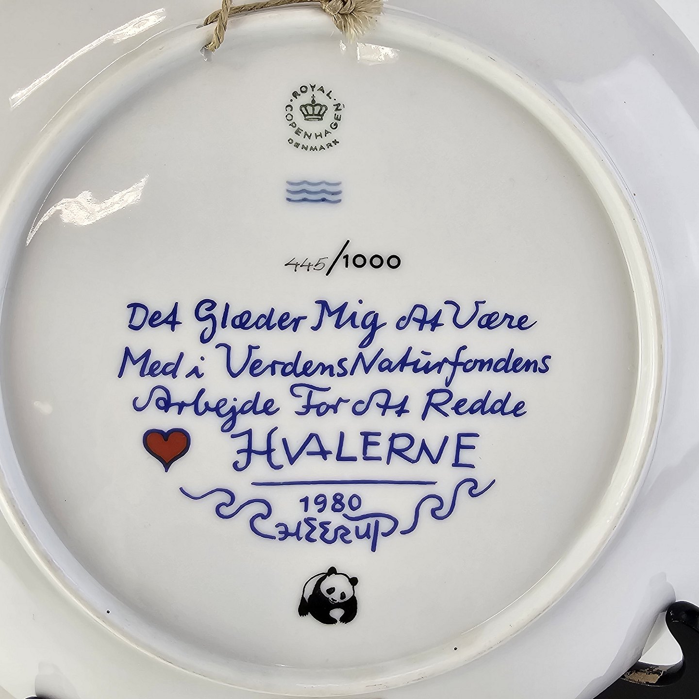 Platte af kongeligt porcelæn med motiv af to hvaler i rød og blå nuancer. Nr. 445/100