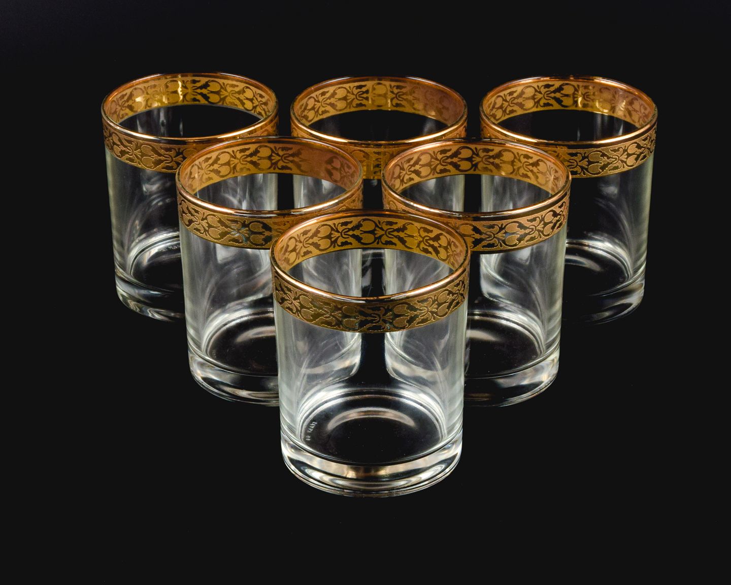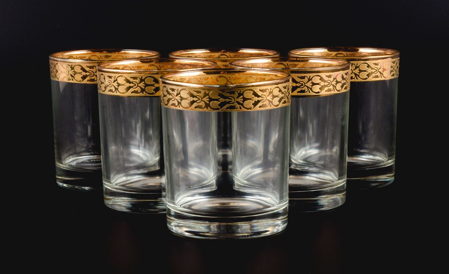 Italian design, six water glasses in clear art glass with gold rim. Approx. 1960s/70s. In perfect condition. Marked. Dimensions: H 9.0 x 7.5 cm.